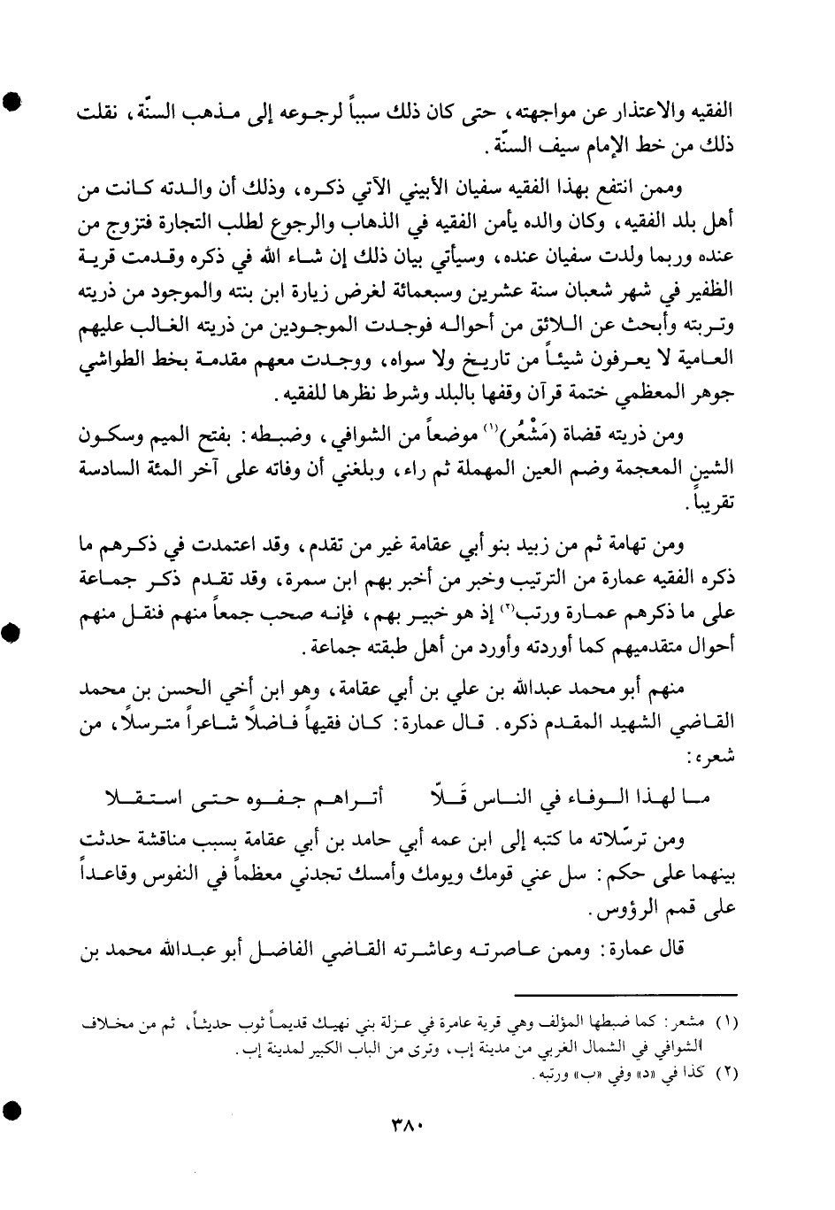 وَمن ذُريَّته قُضَاة مشْعر موضعا من الشوافي وَضَبطه بِفَتْح الْمِيم وَسُكُون الشين الْمُعْجَمَة وَضم الْعين الْمُهْملَة ثمَّ رَاء وَبَلغنِي أَن وَفَاته على آخر المئة السَّادِسَة تَقْرِيبًا