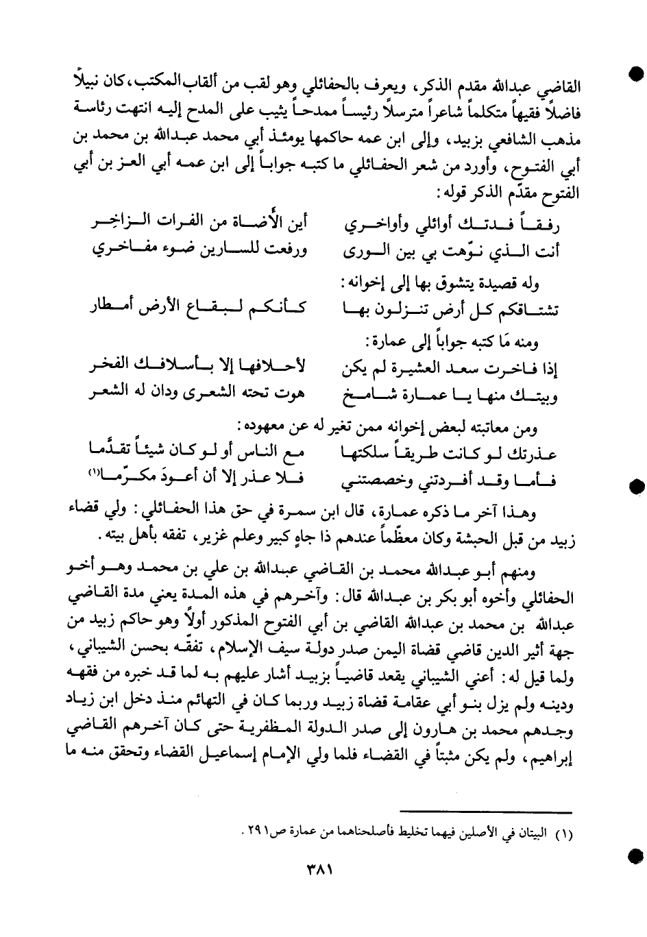 فَأَما وَقد أفردتني وخصصتني ... فَلَا عذر إِلَّا أَن أَعُود مكرما ... وَهَذَا آخر مَا ذكره عمَارَة قَالَ ابْن سَمُرَة فِي حق هَذَا الحفائلي ولي قَضَاء زبيد من قبل الْحَبَشَة وَكَانَ مُعظما عِنْدهم ذَا جاه كَبِير وَعلم غزير تفقه بِأَهْل بَيته