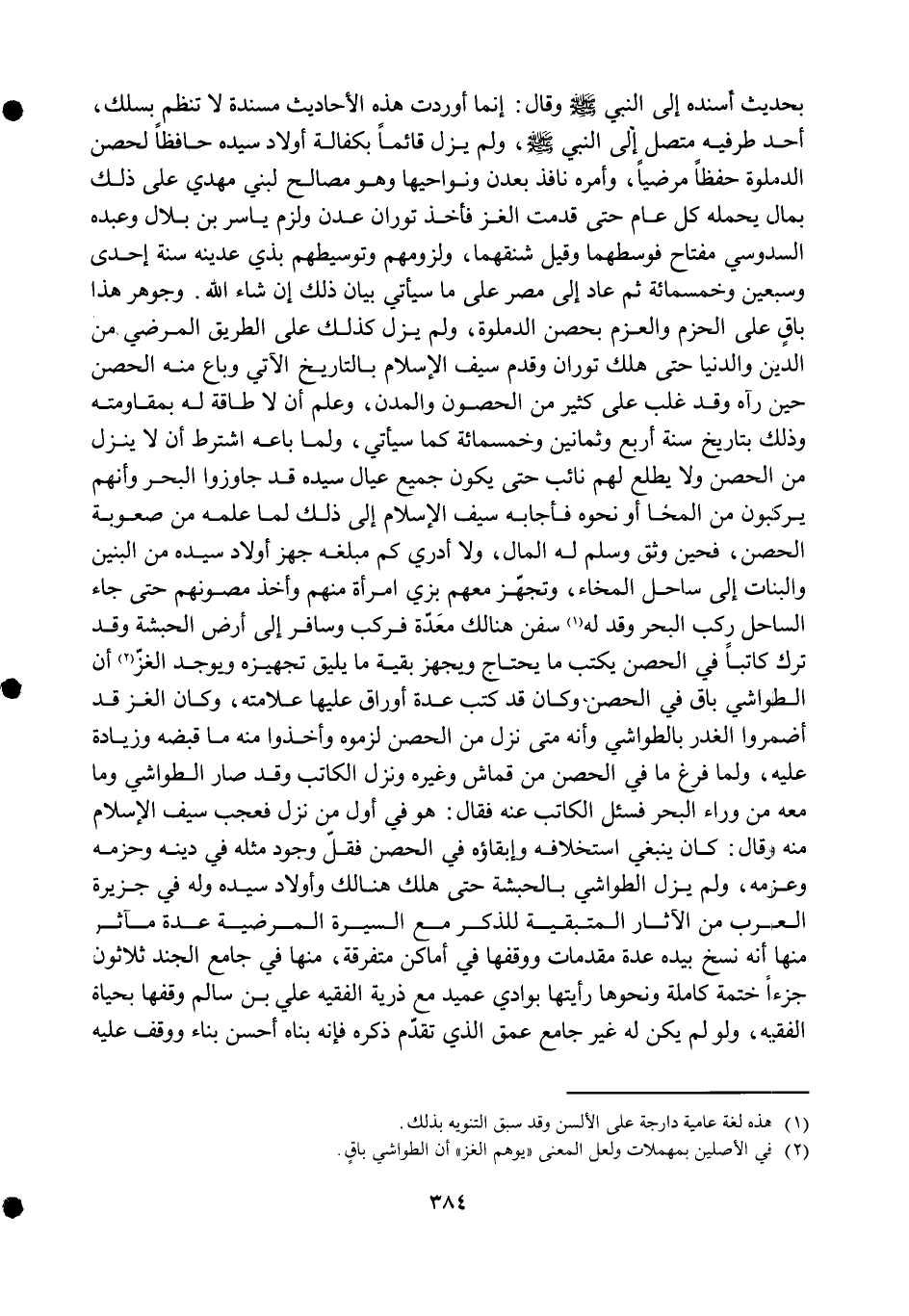 وجوهر هَذَا بَاقٍ على الحزم والعزم بحصن الدملوة وَلم يزل كَذَلِك على الطَّرِيق المرضي من الدّين وَالدُّنْيَا حَتَّى هلك توران وَقدم سيف الْإِسْلَام بالتاريخ الْآتِي وَبَاعَ مِنْهُ الْحصن حِين رَآهُ وَقد غلب على كثير من الْحُصُون والمدن وَعلم أَن لَا طَاقَة لَهُ بمقاومته وَذَلِكَ بتاريخ سنة أَربع وَثَمَانِينَ وَخَمْسمِائة كَمَا سَيَأْتِي وَلما بَاعه اشْترط أَن لَا ينزل من الْحصن وَلَا يطلع لَهُم نَائِب حَتَّى يكون جَمِيع عِيَال سَيّده قد جاوزوا الْبَحْر وَأَنَّهُمْ يركبون من المخا أَو نَحوه فَأَجَابَهُ سيف الْإِسْلَام إِلَى ذَلِك لما علمه من صعوبة الْحصن فحين وثق وَسلم لَهُ المَال وَلَا أَدْرِي كم مبلغه جهز أَوْلَاد سَيّده من الْبَنِينَ وَالْبَنَات إِلَى سَاحل المخاء وتجهز مَعَهم بزِي امْرَأَة مِنْهُم وَأخذ مصونهم حَتَّى جَاءَ السَّاحِل ركب الْبَحْر وَقد لَهُ سفن هُنَالك معدة فَركب وسافر إِلَى أَرض الْحَبَشَة وَقد ترك كَاتبا فِي الْحصن يكْتب مَا يحْتَاج ويجهز بَقِيَّة مَا يَلِيق تَجْهِيزه وَيُوجد الغز أَن الطواشي بَاقٍ فِي الْحصن وَكَانَ قد كتب عدَّة أوراق عَلَيْهَا علامته وَكَانَ الغز قد أضمروا الْغدر بالطواشي وَأَنه مَتى نزل من الْحصن لزموه وَأخذُوا مِنْهُ مَا قَبضه وَزِيَادَة عَلَيْهِ وَلما فرغ مَا فِي الْحصن من قماش وَغَيره وَنزل الْكَاتِب وَقد صَار الطواشي وَمَا مَعَه من وَرَاء الْبَحْر فَسئلَ الْكَاتِب عَنهُ فَقَالَ هُوَ فِي أول من نزل فَعجب سيف الْإِسْلَام مِنْهُ وَقَالَ كَانَ يَنْبَغِي استخلافه وإبقاؤه فِي الْحصن فَقل وجود مثله فِي دينه وحزمه وعزمه وَلم يزل الطواشي بِالْحَبَشَةِ حَتَّى هلك هُنَالك وَأَوْلَاد سَيّده وَله فِي جَزِيرَة الْعَرَب من الْآثَار المتبقية للذّكر مَعَ السِّيرَة المرضية عدَّة مآثر مِنْهَا أَنه نسخ بِيَدِهِ عدَّة مُقَدمَات ووقفها فِي أَمَاكِن مُتَفَرِّقَة مِنْهَا فِي جَامع الْجند ثَلَاثُونَ جُزْءا ختمة كَامِلَة وَنَحْوهَا رَأَيْتهَا بوادي عميد مَعَ ذُرِّيَّة الْفَقِيه عَليّ بن سَالم وَقفهَا بحياة الْفَقِيه وَلَو لم يكن لَهُ غير جَامع عمق الَّذِي تقدم ذكره فَإِنَّهُ بناه أحسن بِنَاء ووقف عَلَيْهِ