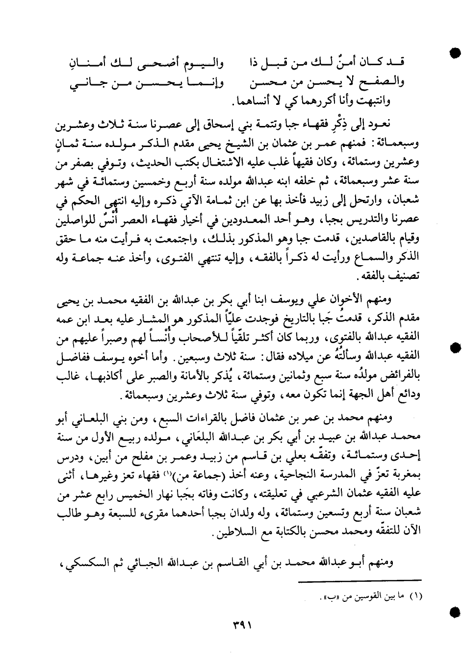 نعود إِلَى ذكر فُقَهَاء جبا وتتمة بني إِسْحَاق إِلَى عصرنا سنة ثَلَاث وَعشْرين وَسَبْعمائة فَمنهمْ عمر بن عُثْمَان بن الشَّيْخ يحيى مقدم الذّكر مولده سنة ثَمَان وَعشْرين وسِتمِائَة وَكَانَ فَقِيها غلب عَلَيْهِ الِاشْتِغَال بكتب الحَدِيث وَتُوفِّي بصفر من سنة عشر وَسَبْعمائة ثمَّ خَلفه ابْنه عبد الله مولده سنة أَربع وَخمسين وسِتمِائَة فِي شهر شعْبَان وارتحل إِلَى زبيد فَأخذ بهَا عَن ابْن ثُمَامَة الْآتِي ذكره وَإِلَيْهِ انْتهى الحكم فِي عصرنا والتدريس بجبا وَهُوَ أحد الْمَعْدُودين فِي أخيار فُقَهَاء الْعَصْر أنس للواصلين وَقيام بالقاصدين قدمت جبا وَهُوَ الْمَذْكُور بذلك وَاجْتمعت بِهِ فَرَأَيْت مِنْهُ مَا حقق الذّكر وَالسَّمَاع وَرَأَيْت لَهُ ذكرا بالفقه وَإِلَيْهِ تَنْتَهِي الْفَتْوَى وَأخذ عَنهُ جمَاعَة وَله تصنيف بالفقه