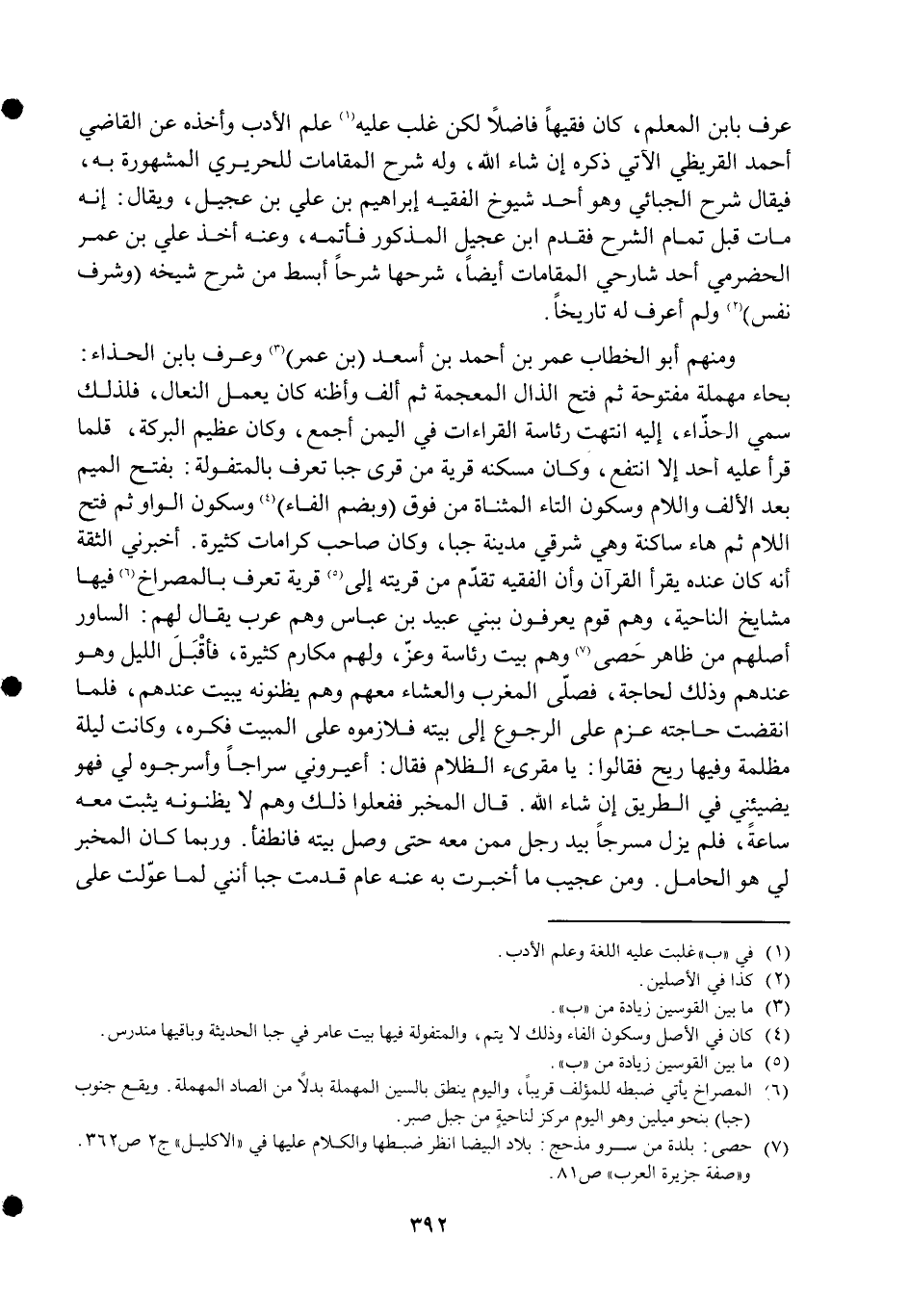 وَمِنْهُم أَبُو الْخطاب عمر بن أَحْمد بن أسعد بن عمر وَعرف بِابْن الْحذاء بحاء مُهْملَة مَفْتُوحَة ثمَّ فتح الذَّال الْمُعْجَمَة ثمَّ ألف وَأَظنهُ كَانَ يعْمل النِّعَال فَلذَلِك سمي الْحذاء إِلَيْهِ انْتَهَت رئاسة الْقرَاءَات فِي الْيمن أجمع وَكَانَ عَظِيم الْبركَة قَلما قَرَأَ عَلَيْهِ أحد إِلَّا انْتفع وَكَانَ مَسْكَنه قَرْيَة من قرى جبا تعرف بالمتفولة بِفَتْح الْمِيم بعد الْألف وَاللَّام وَسُكُون التَّاء الْمُثَنَّاة من فَوق وبضم الْفَاء وَسُكُون الْوَاو ثمَّ فتح اللَّام ثمَّ هَاء سَاكِنة وَهِي شَرْقي مَدِينَة جبا وَكَانَ صَاحب كرامات كَثِيرَة