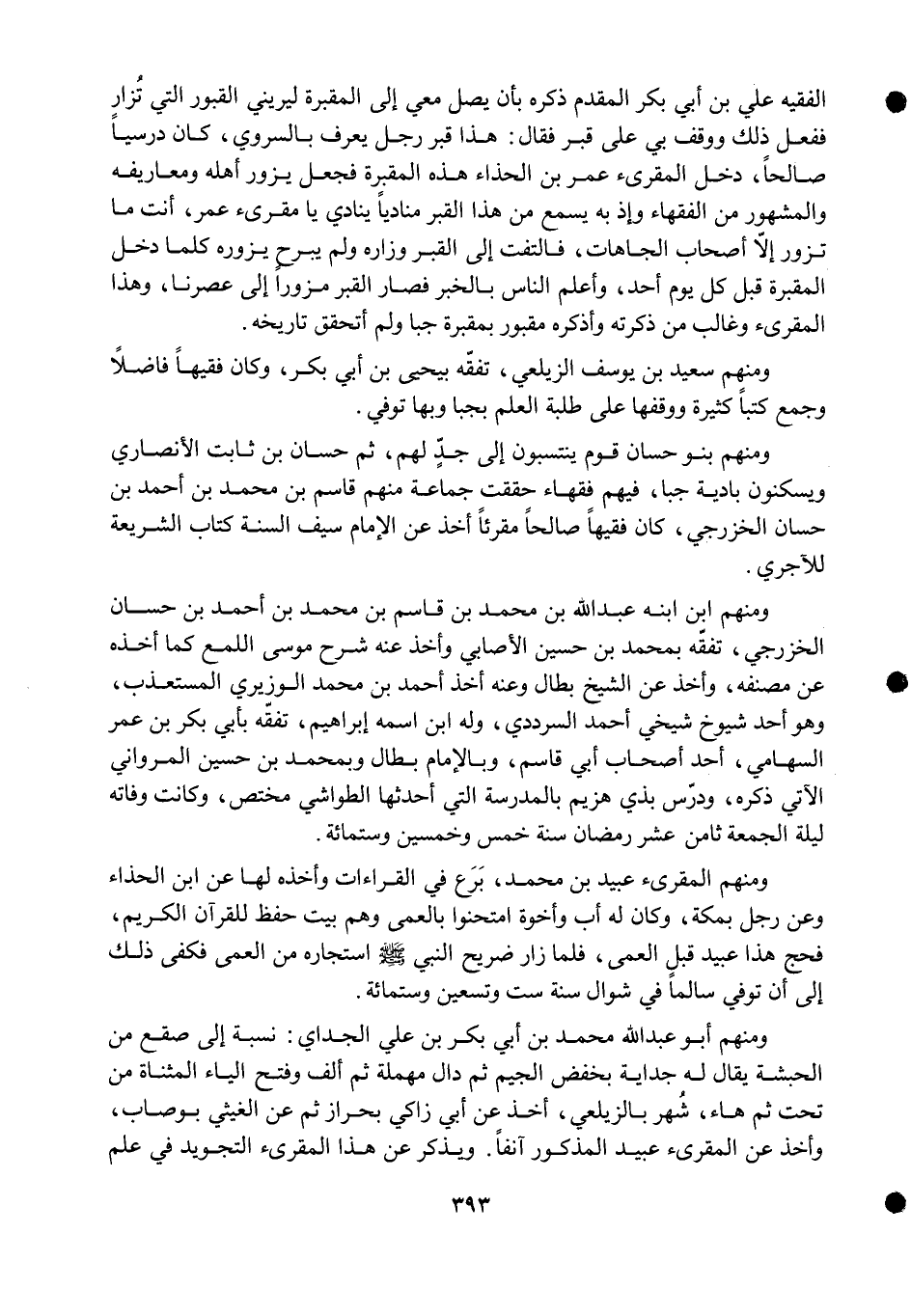 الْفَقِيه عَليّ بن أبي بكر الْمُقدم ذكره بِأَن يصل معي إِلَى الْمقْبرَة ليريني الْقُبُور الَّتِي تزار فَفعل ذَلِك ووقف بِي على قبر فَقَالَ هَذَا قبر رجل يعرف بالسروي كَانَ درسيا صَالحا دخل المقرىء عمر بن الْحذاء هَذِه الْمقْبرَة فَجعل يزور أَهله ومعاريفه وَالْمَشْهُور من الْفُقَهَاء وَإِذ بِهِ يسمع من هَذَا الْقَبْر مناديا يُنَادي يَا مقرىء عمر أَنْت مَا تزور إِلَّا أَصْحَاب الجاهات فَالْتَفت إِلَى الْقَبْر وزاره وَلم يبرح يزوره كلما دخل الْمقْبرَة قبل كل يَوْم أحد وَأعلم النَّاس بالْخبر فَصَارَ الْقَبْر مزورا إِلَى عصرنا وَهَذَا المقرىء وغالب من ذكرته وأذكره مقبور بمقبرة جبا وَلم أتحقق تَارِيخه