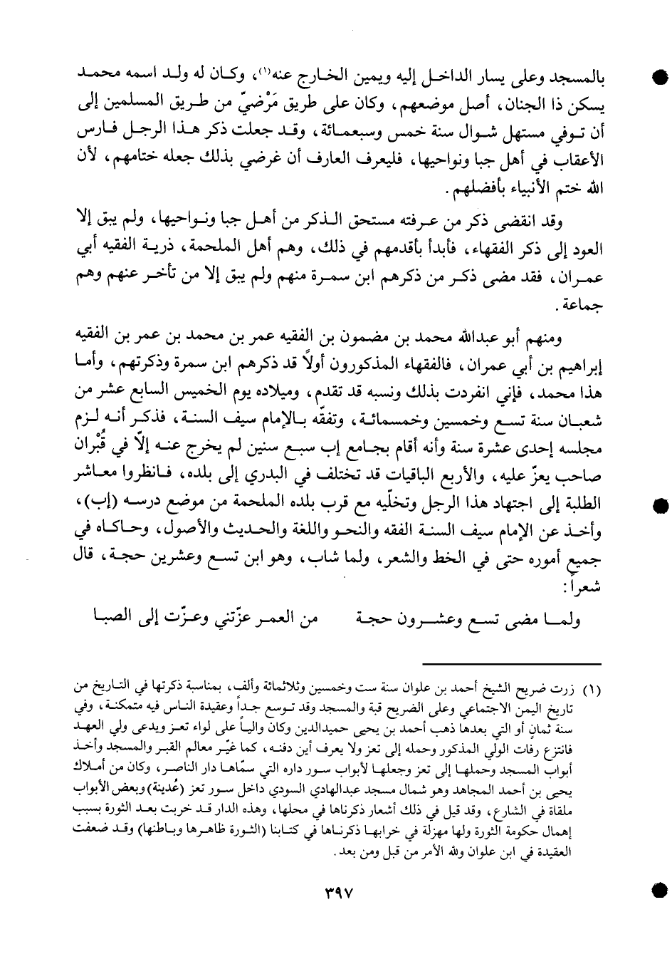 وَمِنْهُم أَبُو عبد الله مُحَمَّد بن مَضْمُون بن الْفَقِيه عمر بن مُحَمَّد بن عمر بن الْفَقِيه إِبْرَاهِيم بن أبي عمرَان فالفقهاء المذكورون أَولا قد ذكرهم ابْن سَمُرَة وذكرتهم وَأما هَذَا مُحَمَّد فَإِنِّي انْفَرَدت بذلك وَنسبه قد تقدم وميلاده يَوْم الْخَمِيس السَّابِع عشر من شعْبَان سنة تسع وَخمسين وَخَمْسمِائة وتفقه بِالْإِمَامِ سيف السّنة فَذكر أَنه لزم مَجْلِسه إِحْدَى عشرَة سنة وَأَنه أَقَامَ بِجَامِع إب سبع سِنِين لم يخرج عَنهُ إِلَّا فِي قبران صَاحب يعز عَلَيْهِ والأربع الْبَاقِيَات قد تخْتَلف فِي البدري إِلَى بَلَده فانظروا معاشر الطّلبَة إِلَى اجْتِهَاد هَذَا الرجل وتخليه مَعَ قرب بَلَده الملحمة من مَوضِع درسه إب وَأخذ عَن الإِمَام سيف السّنة الْفِقْه والنحو واللغة والْحَدِيث وَالْأُصُول وحاكاه فِي جَمِيع أُمُوره حَتَّى فِي الْخط وَالشعر وَلما شَاب وَهُوَ ابْن تسع وَعشْرين حجَّة قَالَ شعرًا ... وَلما مضى تسع وَعِشْرُونَ حجَّة ... من الْعُمر عزتني وعزت إِلَى الصِّبَا ...