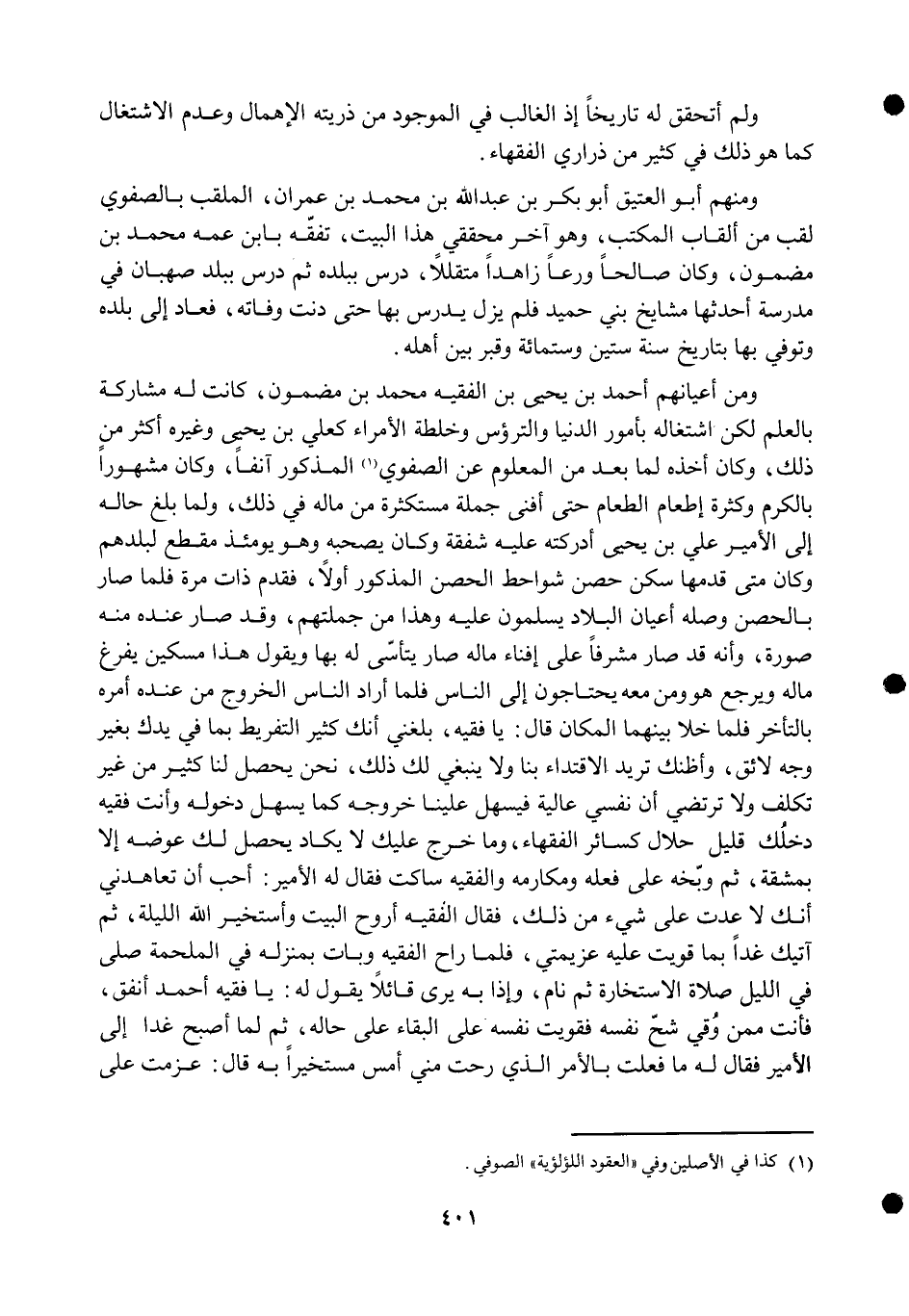 وَمن أعيانهم أَحْمد بن يحيى بن الْفَقِيه مُحَمَّد بن مَضْمُون كَانَت لَهُ مُشَاركَة بِالْعلمِ لَكِن اشْتِغَاله بِأُمُور الدُّنْيَا والترؤس وخلطة الْأُمَرَاء كعلي بن يحيى وَغَيره أَكثر من ذَلِك وَكَانَ أَخذه لما بعد من الْمَعْلُوم عَن الصفوي الْمَذْكُور آنِفا وَكَانَ مَشْهُورا بِالْكَرمِ وَكَثْرَة إطْعَام الطَّعَام حَتَّى أفنى جملَة مستكثرة من مَاله فِي ذَلِك وَلما بلغ حَاله إِلَى الْأَمِير عَليّ بن يحيى أَدْرَكته عَلَيْهِ شَفَقَة وَكَانَ يَصْحَبهُ وَهُوَ يَوْمئِذٍ مقطع لبلدهم وَكَانَ مَتى قدمهَا سكن حصن شواحط الْحصن الْمَذْكُور أَولا فَقدم ذَات مرّة فَلَمَّا صَار بالحصن وَصله أَعْيَان الْبِلَاد يسلمُونَ عَلَيْهِ وَهَذَا من جُمْلَتهمْ وَقد صَار عِنْده مِنْهُ صُورَة وَأَنه قد صَار مشرفا على إفناء مَاله صَار يتأسى لَهُ بهَا وَيَقُول هَذَا مِسْكين يفرغ مَاله وَيرجع هُوَ وَمن مَعَه يَحْتَاجُونَ إِلَى النَّاس فَلَمَّا أَرَادَ النَّاس الْخُرُوج من عِنْده أمره بالتاخر فَلَمَّا خلا بَينهمَا الْمَكَان قَالَ يَا فَقِيه بَلغنِي أَنَّك كثير التَّفْرِيط بِمَا فِي يدك بِغَيْر وَجه لَائِق وأظنك تُرِيدُ الِاقْتِدَاء بِنَا وَلَا يَنْبَغِي لَك ذَلِك نَحن يحصل لنا كثير من غير تكلّف وَلَا تَرْتَضِي أَن نَفسِي عالية فيسهل علينا خُرُوجه كَمَا يسهل دُخُوله وَأَنت فَقِيه دَخلك قَلِيل حَلَال كَسَائِر الْفُقَهَاء وَمَا خرج عَلَيْك لَا يكَاد يحصل لَك عوضه إِلَّا بِمَشَقَّة ثمَّ وبخه على فعله ومكارمه والفقيه سَاكِت فَقَالَ لَهُ الْأَمِير أحب أَن تعاهدني أَنَّك لَا عدت على شَيْء من ذَلِك فَقَالَ الْفَقِيه أروح الْبَيْت وأستخير الله اللَّيْلَة ثمَّ أتيك غَدا بِمَا قويت عَلَيْهِ عزيمتي فَلَمَّا رَاح الْفَقِيه وَبَات بمنزله فِي الملحمة صلى فِي اللَّيْل صَلَاة الاستخارة ثمَّ نَام وَإِذا بِهِ يرى قَائِلا يَقُول لَهُ يَا فَقِيه أَحْمد أنْفق فَأَنت مِمَّن وقِي شح نَفسه فَقَوِيت نَفسه على الْبَقَاء على حَاله ثمَّ لما أصبح غَدا إِلَى الْأَمِير فَقَالَ لَهُ مَا فعلت بِالْأَمر الَّذِي رحت مني أمس متسخيرا بِهِ قَالَ عزمت على