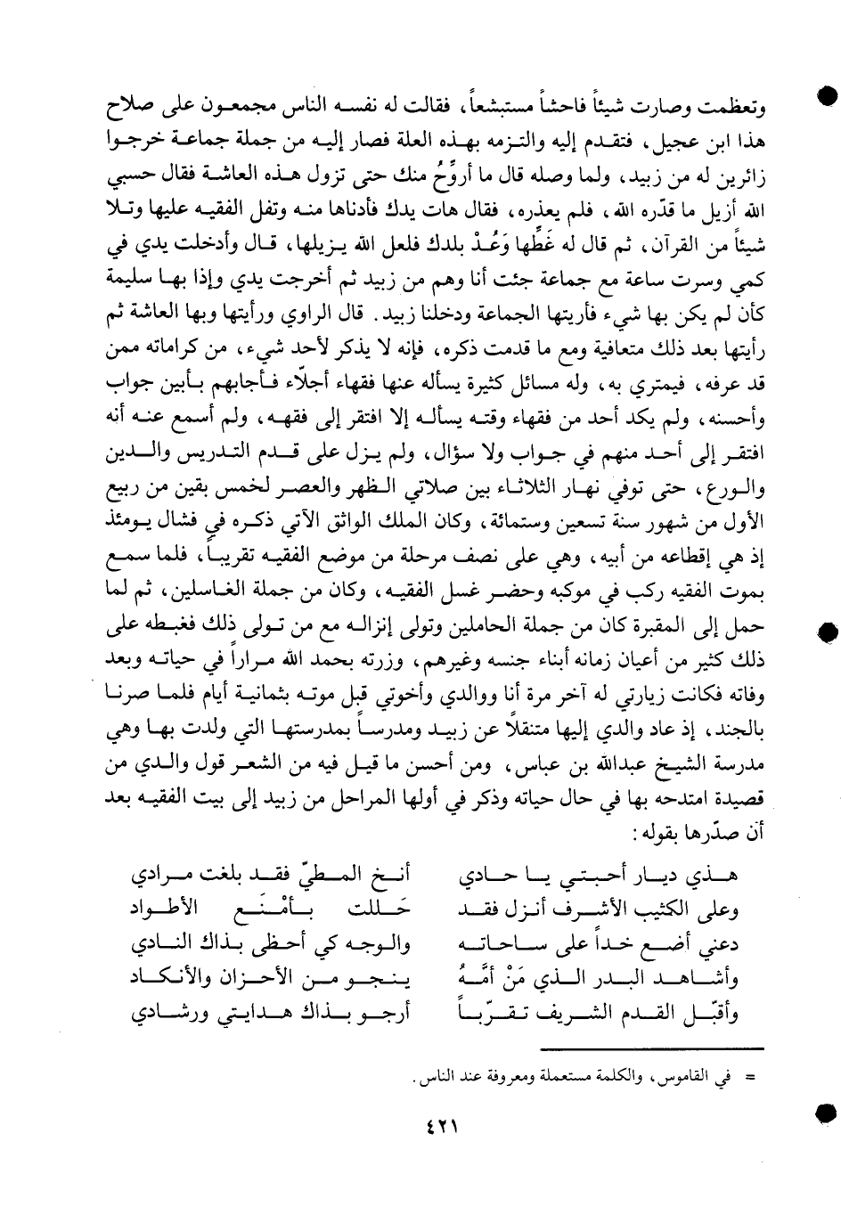 قَالَ الرَّاوِي ورأيتها وَبهَا العاشة ثمَّ رَأَيْتهَا بعد ذَلِك متعافية وَمَعَ مَا قدمت ذكره فَإِنَّهُ لَا يذكر لأحد شَيْء من كراماته مِمَّن قد عرفه فيمتري بِهِ وَله مسَائِل كَثِيرَة يسْأَله عَنْهَا فُقَهَاء أجلاء فأجابهم بأبين جَوَاب وَأحسنه وَلم يكد أحد من فُقَهَاء وقته يسْأَله إِلَّا افْتقر إِلَى فقهه وَلم أسمع عَنهُ أَنه افْتقر إِلَى أحد مِنْهُم فِي جَوَاب وَلَا سُؤال وَلم يزل على قدم التدريس وَالدّين والورع حَتَّى توفّي نَهَار الثُّلَاثَاء بَين صَلَاتي الظّهْر وَالْعصر لخمس بَقينَ من ربيع الأول من شهور سنة تسعين وسِتمِائَة وَكَانَ الْملك الواثق الْآتِي ذكره فِي فشال يَوْمئِذٍ إِذْ هِيَ إقطاعه من أَبِيه وَهِي على نصف مرحلة من مَوضِع الْفَقِيه تَقْرِيبًا فَلَمَّا سمع بِمَوْت الْفَقِيه ركب فِي موكبه وَحضر غسل الْفَقِيه وَكَانَ من جملَة الغاسلين ثمَّ لما حمل إِلَى الْمقْبرَة كَانَ من جملَة الحاملين وَتَوَلَّى إنزاله مَعَ من تولى ذَلِك فغبطه على ذَلِك كثير من أَعْيَان زَمَانه أَبنَاء جنسه وَغَيرهم وزرته بِحَمْد الله مرَارًا فِي حَيَاته وَبعد وَفَاته فَكَانَت زيارتي لَهُ آخر مرّة أَنا ووالدي وأخوتي قبل مَوته بِثمَانِيَة أَيَّام فَلَمَّا صرنا بالجند إِذْ عَاد وَالِدي إِلَيْهَا متنقلا عَن زبيد ومدرسا بمدرستها الَّتِي ولدت بهَا وَهِي مدرسة الشَّيْخ عبد الله بن عَبَّاس وَمن أحسن مَا قيل فِيهِ من الشّعْر قَول وَالِدي من قصيدة امتدحه بهَا فِي حَال حَيَاته وَذكر فِي أَولهَا المراحل من زبيد إِلَى بَيت الْفَقِيه بعد أَن صدرها بقوله ... هذي ديار أحبتي يَا حادي ... أنخ الْمطِي فقد بلغت مرادي