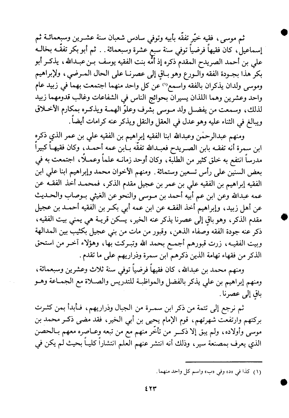 ثمَّ نرْجِع إِلَى تَتِمَّة من ذكر ابْن سَمُرَة من الْجبَال وذراريهم فأبدأ بِمن كثرت بركتهم وَارْتَفَعت شهرتهم قوم الإِمَام يحيى بن أبي الْخَيْر فقد مضى ذكر مُحَمَّد بن مُوسَى وَأَوْلَاده وَلم يبْق إِلَّا ذكر من تَأَخّر مِنْهُم مَعَ من تبعه وعاصره مَعَهم بالحصن الَّذِي يعرف بمصنعة سير وَذَلِكَ أَنه انْتَشَر عَنْهُم الْعلم انتشارا كليا بِحَيْثُ لم يكن فِي
