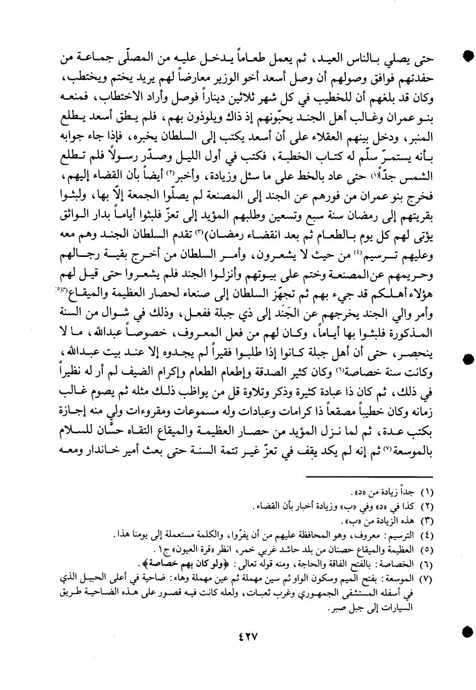 حَتَّى يُصَلِّي بِالنَّاسِ الْعِيد ثمَّ يعْمل طَعَاما يدْخل عَلَيْهِ من الْمصلى جمَاعَة من حفدتهم فَوَافَقَ وصولهم أَن وصل أسعد أَخُو الْوَزير مُعَارضا لَهُم يُرِيد يخْتم ويختطب وَكَانَ قد بَلغهُمْ أَن للخطيب فِي كل شهر ثَلَاثِينَ دِينَارا فوصل وَأَرَادَ الاختطاب فَمَنعه بَنو عمرَان وغالب أهل الْجند يحبونهم إِذْ ذَاك ويلوذون بهم فَلم يطق أسعد يطلع الْمِنْبَر وَدخل بَينهم الْعُقَلَاء على أَن أسعد يكْتب إِلَى السُّلْطَان يُخبرهُ فَإِذا جَاءَ جَوَابه بِأَنَّهُ يسْتَمر سلم لَهُ كتاب الْخطْبَة فَكتب فِي أول اللَّيْل وَصدر رَسُولا فَلم تطلع الشَّمْس جدا حَتَّى عَاد بالخط على مَا سُئِلَ وَزِيَادَة وَأخْبر أَيْضا بِأَن الْقَضَاء إِلَيْهِم فَخرج بَنو عمرَان من فورهم عَن الْجند إِلَى المصنعة لم يصلوا الْجُمُعَة إِلَّا بهَا وَلَبِثُوا بقريتهم إِلَى رَمَضَان سنة سبع وَتِسْعين وطلبهم الْمُؤَيد إِلَى تعز فلبثوا أَيَّامًا بدار الواثق يُؤْتى لَهُم كل يَوْم بِالطَّعَامِ ثمَّ بعد انْقِضَاء رَمَضَان تقدم السُّلْطَان الْجند وهم مَعَه وَعَلَيْهِم ترسيم من حَيْثُ لَا يَشْعُرُونَ وَأمر السُّلْطَان من أخرج بَقِيَّة رِجَالهمْ وحريمهم عَن المصنعة وَختم على بُيُوتهم وأنزلوا الْجند فَلم يشعروا حَتَّى قيل لَهُم هَؤُلَاءِ أهلكم قد جِيءَ بهم ثمَّ تجهز السُّلْطَان إِلَى صنعاء لحصار الْعَظِيمَة والميقاع وَأمر وَالِي الْجند يخرجهم عَن الْجند إِلَى ذِي جبلة فَفعل وَذَلِكَ فِي شَوَّال من السّنة الْمَذْكُورَة فلبثوا بهَا أَيَّامًا وَكَانَ لَهُم من فعل الْمَعْرُوف خُصُوصا عبد الله مَا لَا ينْحَصر حَتَّى أَن أهل جبلة كَانُوا إِذا طلبُوا فَقِيرا لم يجدوه إِلَّا عِنْد بَيت عبد الله وَكَانَت سنة خصَاصَة وَكَانَ كثير الصَّدَقَة وإطعام الطَّعَام وإكرام الضَّيْف لم أر لَهُ نظيرا فِي ذَلِك ثمَّ كَانَ ذَا عبَادَة كَثِيرَة وَذكر وتلاوة قل من يواظب ذَلِك مثله ثمَّ يَصُوم غَالب زَمَانه وَكَانَ خَطِيبًا مصقعا ذَا كرامات وعبادات وَله مسموعات ومقروءات ولي مِنْهُ إجَازَة بكتب عدَّة ثمَّ لما نزل الْمُؤَيد من حِصَار الْعَظِيمَة والميقاع التقاه حسان للسلام بالموسعة ثمَّ إِنَّه لم يكد يقف فِي تعز غير تَتِمَّة السّنة حَتَّى بعث أَمِير خاندار مَعَه