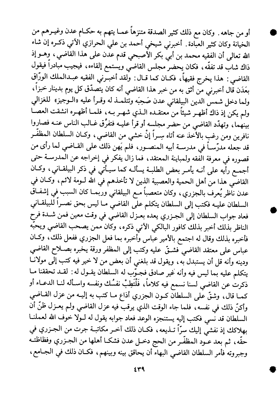 أَخْبرنِي شَيْخي أَحْمد بن عَليّ الْحرَازِي الْآتِي ذكره إِن شَاءَ الله تَعَالَى أَن الْفَقِيه مُحَمَّد بن أبي بكر الأصبحي قدم عدن على هَذَا القَاضِي وَهُوَ إِذْ ذَاك شَاب قد تفقه فَكَانَ يحضر مجْلِس القَاضِي ويستمع إلقاءه فيجيب مبادرا فَيَقُول القَاضِي هَذَا يخرج فَقِيها فَكَانَ كَمَا قَالَ وَلَقَد أَخْبرنِي الْفَقِيه عبد الْملك الْوراق بعدن قَالَ أَخْبرنِي من أَثِق بِهِ من خبر هَذَا القَاضِي أَنه كَانَ يتَصَدَّق كل يَوْم بِدِينَار خبْزًا وَلما دخل شمس الدّين البيلقاني عدن صَحبه وتتلمذ لَهُ وَقَرَأَ عَلَيْهِ الْوَجِيز للغزالي وَلم يكن إِذْ ذَاك أظهر شَيْئا من معتقده الَّذِي شهر بِهِ فَلَمَّا أظهره انشقت الْعَصَا بَينهمَا وتهدد القَاضِي من حضر مَجْلِسه أَو قَرَأَ عَلَيْهِ فَتفرق غَالب النَّاس عَنهُ فصاروا نافرين وَمن رغب بِالْأَخْذِ عَنهُ أَتَاهُ سرا إِن خشِي من القَاضِي وَكَانَ السُّلْطَان المظفر قد جعله مدرسا فِي مدرسة أَبِيه الْمَنْصُور فَلم يهن ذَلِك على القَاضِي لما رأى من قصوره فِي معرفَة الْفِقْه ولمباينة المعتقد فَمَا زَالَ يفكر فِي إِخْرَاجه عَن الْمدرسَة حَتَّى أجمع رَأْيه على أَنه يَأْمر بعض الطّلبَة يسْأَله كَمَا سَيَأْتِي فِي ذكر البيلقاني وَكَانَ القَاضِي هَذَا من أهل الحمية والعصبية الَّذين لَا تأخذهم فِي الله لومة لائم وَكَانَ فِي عدن نَاظر يعرف بالجزري وَكَانَ متعصبا مَعَ البيلقاني وَرُبمَا كَانَ السَّبَب فِي إشفاق السُّلْطَان عَلَيْهِ فَكتب إِلَى السُّلْطَان يتَكَلَّم على القَاضِي مَا لَيْسَ بِحَق نصرا للبيلقاني فَعَاد جَوَاب السُّلْطَان إِلَى الْجَزرِي يعده بعزل القَاضِي فِي وَقت معِين فَمن شدَّة فَرح النَّاظر بذلك أخبر بذلك كافور البالكي الْآتِي ذكره وَكَانَ مِمَّن يصحب القَاضِي وَيُحِبهُ فَأخْبرهُ بذلك وَقَالَ لَهُ اجْتمع بالأمير عَبَّاس وَأخْبرهُ بِمَا فعل الْجَزرِي فَفعل ذَلِك وَكَانَ عَبَّاس على مُعْتَقد القَاضِي فشق عَلَيْهِ وَكتب إِلَى المظفر ورقة يُخبرهُ بصلاح القَاضِي وَدينه وَأَنه قل أَن يسْتَبْدل بِهِ وَيَقُول قد بَلغنِي أَن بعض من لَا خير فِيهِ كتب إِلَى مَوْلَانَا يتَكَلَّم عَلَيْهِ بِمَا لَيْسَ فِيهِ وَأَنه غير صَادِق فجوب لَهُ السُّلْطَان يَقُول لَهُ لقد تحققنا مَا ذكرت عَن القَاضِي لسنا نسْمع فِيهِ كلَاما فلتطب نَفسك وَنَفسه واسأله لنا الدُّعَاء أَو كَمَا قَالَ وشق على السُّلْطَان كَون الْجَزرِي أذاع مَا كتب بِهِ إِلَيْهِ من عزل القَاضِي وأكن ذَلِك فِي نَفسه فَلَمَّا جَاءَ الْوَقْت الَّذِي يرقب فِيهِ عزل القَاضِي وَلم يعْزل ظن أَن السُّلْطَان قد نسي فَكتب إِلَيْهِ يستنجزه الْوَعْد فَعَاد جَوَابه يَقُول لَهُ لَوْلَا خوف الله لعملنا بهلاكك إِذْ نفشي إِلَيْك سرا تذيعه فَكَانَ ذَلِك آخر مُكَاتبَة جرت من الْجَزرِي فِي حَقه ثمَّ بعد عود المظفر من الْحَج دخل عدن فَشَكا أَهلهَا من الْجَزرِي وفظاظته وجبروته فَأمر السُّلْطَان القَاضِي الْبَهَاء أَن يحاقق بَينه وَبينهمْ فَكَانَ ذَلِك فِي الْجَامِع