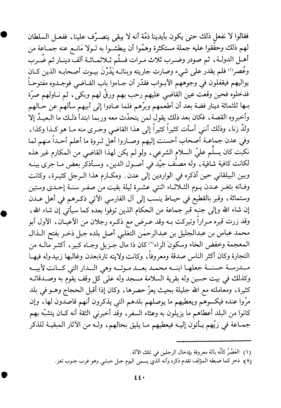 فَقَالُوا لَا نَفْعل ذَلِك حَتَّى يكون بِأَيْدِينَا ذمَّة أَنه لَا يبْقى يتَصَرَّف علينا فَفعل السُّلْطَان لَهُم ذَلِك وحققوا عَلَيْهِ جملَة مستكثرة وهموا أَن يبطشوا بِهِ لَوْلَا مَانع عَنهُ جمَاعَة من أهل الدولة ثمَّ صودر وَضرب ثَلَاث مَرَّات فَسلم ثَلَاثمِائَة ألف دِينَار ثمَّ ضرب وعصر فَلم يقدر على شَيْء وَصَارَت جَارِيَته وَبنَاته يدرن بيُوت أَصْحَابه الَّذين كَانَ يواليهم فيقفلون فِي وُجُوههم الْأَبْوَاب فَقدر أَن جَاءُوا بَاب القَاضِي فوجدوه مَفْتُوحًا فدخلوه فحين وَقعت عين القَاضِي عَلَيْهِم رحب بهم ورق لَهُم وَبكى ثمَّ ناولهم صرة بهَا ثلثمِائة دِينَار فضَّة بعد أَن أطْعمهُم وبرهم فَلَمَّا عَادوا إِلَى أَبِيهِم سَأَلَهُمْ عَن حَالهم وَأَخْبرُوهُ الْقِصَّة فَكَانَ بعد ذَلِك يَقُول لمن يتحدث مَعَه وَرُبمَا ابْتَدَأَ ذَلِك مَا الْبعيد إِلَّا ولد زنا وَذَلِكَ أنني أَسَأْت كثيرا كثيرا إِلَى هَذَا القَاضِي وَجرى مِنْهُ مَا هُوَ كَذَا وَكَذَا وَفِي عدن جمَاعَة أَصْحَاب أَحْسَنت إِلَيْهِم وصاروا أهل ثروة مَا أعلم أحدا مِنْهُم لما نكبت كَانَ يسلم عَليّ السَّلَام الشَّرْعِيّ وَلَو لم يكن لهَذَا القَاضِي من المكارم غير هَذِه لكَانَتْ كَافِيَة شافية وَله مُصَنف جيد فِي أصُول الدّين وسأذكر بعض مَا جرى بَينه وَبَين البيلقاني حِين أذكرهُ فِي الواردين إِلَى عدن وَمَكَارِم هَذَا الرجل كَثِيرَة وَكَانَت وَفَاته بثغر عدن يَوْم الثُّلَاثَاء اثْنَتَيْ عشرَة لَيْلَة بقيت من صفر سنة إِحْدَى وَسِتِّينَ وسِتمِائَة وقبر بالقطيع فِي حياط ينْسب إِلَى آل الْفَارِسِي الْآتِي ذكرهم فِي أهل عدن إِن شَاءَ الله وَإِلَى جنبه قبر جمَاعَة من الْحُكَّام الَّذين توفوا بعده كَمَا سَيَأْتِي إِن شَاءَ الله وَقد زرت قَبره مرَارًا وتبركت بِهِ وَقد عرض مَعَ ذكره رجلَانِ من الْأَعْيَان الأول أَبُو مُحَمَّد عَبَّاس بن عبد الْجَلِيل بن عبد الرَّحْمَن التغلبي أصل بَلَده جبل ذخر بِفَتْح الذَّال الْمُعْجَمَة وخفض الْخَاء وَسُكُون الرَّاء كَانَ ذَا مَال جزيل وجاه كَبِير أَكثر مَاله من التِّجَارَة وَكَانَ أَكثر النَّاس صَدَقَة ومعروفا وَكَانَت ولَايَته تَارَة بعدن وغالبها زبيد وَله فِيهَا مدرسة حَسَنَة جعلهَا ابْنه مُحَمَّد بعد مَوته وَهِي الدَّار الَّتِي كَانَت لِأَبِيهِ وَكَذَلِكَ فِي بَيت حُسَيْن وَله بقرية السَّلامَة مَسْجِد وَله على كل وقف يقوم بِهِ وصدقاته كَثِيرَة ومعاملته مَعَ الله جليلة بِحَيْثُ يعز حصرها وَكَانَ إِذا أقبل الْحجَّاج وَهُوَ فِي بلد مروا عِنْده فيكسوهم ويعطيهم مَا يوصلهم بلدهم الَّتِي يذكرُونَ أَنهم قاصدون لَهَا وَإِن كَانُوا من الْبَلَد أَعْطَاهُم مَا يزيلون بِهِ وعثاء السّفر وَقد أَخْبرنِي الثِّقَة أَنه كَانَ يتشبه بهم جمَاعَة فِي زيهم يأْتونَ إِلَيْهِ فيعطيهم مَا يَلِيق بحالهم وَله من الْآثَار المبقية للذّكر