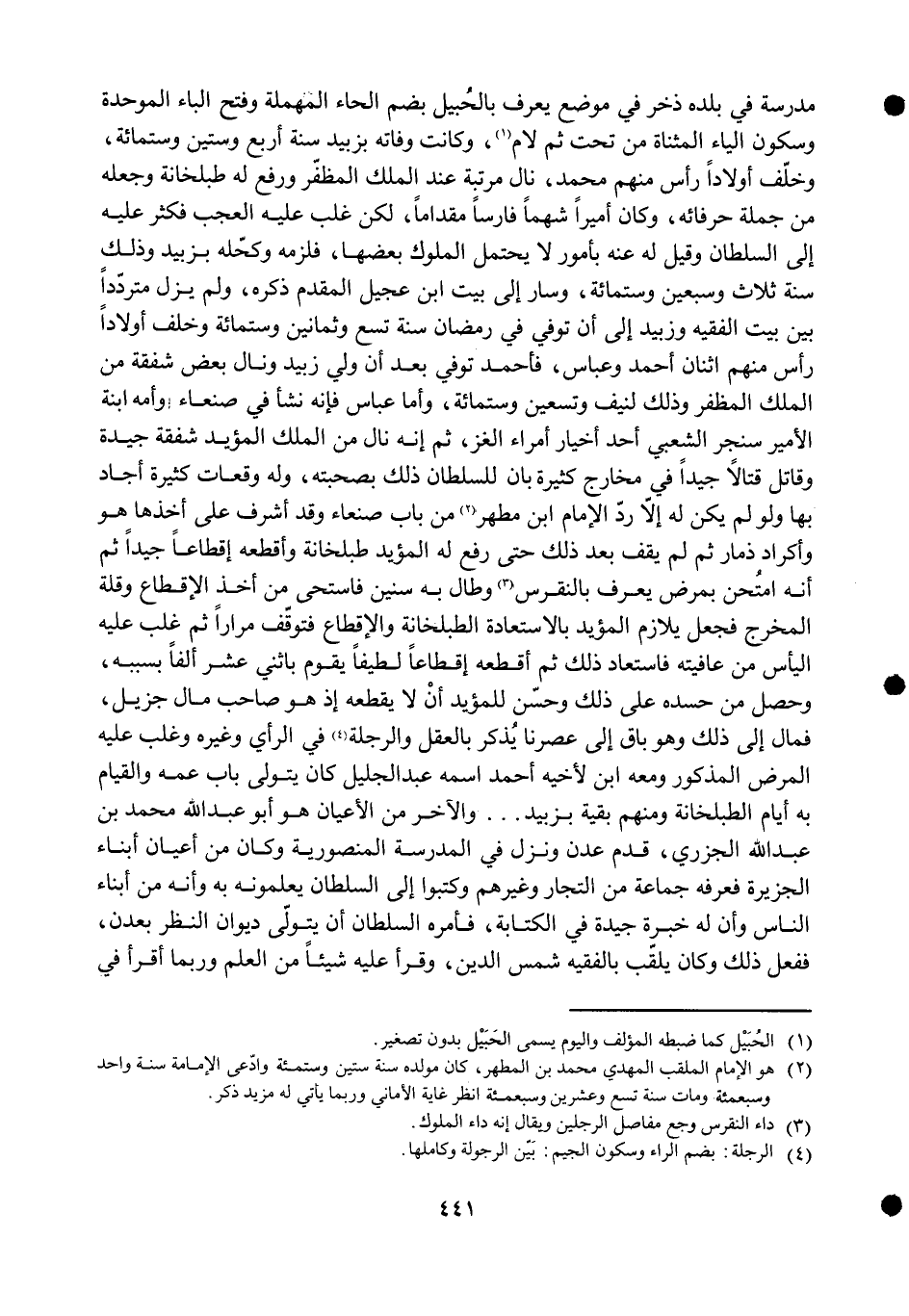 مدرسة فِي بَلَده ذخر فِي مَوضِع يعرف بالحبيل بِضَم الْحَاء الْمُهْملَة وَفتح الْبَاء الْمُوَحدَة وَسُكُون الْيَاء الْمُثَنَّاة من تَحت ثمَّ لَام وَكَانَت وَفَاته بزبيد سنة أَربع وَسِتِّينَ وسِتمِائَة وَخلف أَوْلَادًا رَأس مِنْهُم مُحَمَّد نَالَ مرتبَة عِنْد الْملك المظفر وَرفع لَهُ طبلخانة وَجعله من جملَة حرفائه وَكَانَ أَمِيرا شهما فَارِسًا مقداما لَكِن غلب عَلَيْهِ الْعجب فَكثر عَلَيْهِ إِلَى السُّلْطَان وَقيل لَهُ عَنهُ بِأُمُور لَا يحْتَمل الْمُلُوك بَعْضهَا فَلَزِمَهُ وكحله بزبيد وَذَلِكَ سنة ثَلَاث وَسبعين وسِتمِائَة وَسَار إِلَى بَيت ابْن عجيل الْمُقدم ذكره وَلم يزل مترددا بَين بَيت الْفَقِيه وزبيد إِلَى أَن توفّي فِي رَمَضَان سنة تسع وَثَمَانِينَ وسِتمِائَة وَخلف أَوْلَادًا رَأس مِنْهُم اثْنَان أَحْمد وعباس فَأَحْمَد توفّي بعد أَن ولي زبيد ونال بعض شَفَقَة من الْملك المظفر وَذَلِكَ لنيف وَتِسْعين وسِتمِائَة وَأما عَبَّاس فَإِنَّهُ نَشأ فِي صنعاء وَأمه ابْنة الْأَمِير سنجر الشّعبِيّ أحد أخيار أُمَرَاء الغز ثمَّ إِنَّه نَالَ من الْملك الْمُؤَيد شَفَقَة جَيِّدَة وَقَاتل قتالا جيدا فِي مخارج كَثِيرَة بَان للسُّلْطَان ذَلِك بِصُحْبَتِهِ وَله وقعات كَثِيرَة أَجَاد بهَا وَلَو لم يكن لَهُ إِلَّا رد الإِمَام ابْن مطهر من بَاب صنعاء وَقد أشرف على أَخذهَا هُوَ وأكراد ذمار ثمَّ لم يقف بعد ذَلِك حَتَّى رفع لَهُ الْمُؤَيد طبلخانة وأقطعه إقطاعا جيدا ثمَّ أَنه امتحن بِمَرَض يعرف بالنقرس وَطَالَ بِهِ سِنِين فاستحى من أَخذ الإقطاع وَقلة الْمخْرج فَجعل يلازم الْمُؤَيد بالاستعادة الطبلخانة والإقطاع فتوقف مرَارًا ثمَّ غلب عَلَيْهِ الْيَأْس من عافيته فاستعاد ذَلِك ثمَّ أقطعه إقطاعا لطيفا يقوم بِاثْنَيْ عشر ألفا بِسَبَبِهِ وَحصل من حسده على ذَلِك وَحسن للمؤيد أَن لَا يقطعهُ إِذْ هُوَ صَاحب مَال جزيل فَمَال إِلَى ذَلِك وَهُوَ بَاقٍ إِلَى عصرنا يذكر بِالْعقلِ والرجلة فِي الرَّأْي وَغَيره وَغلب عَلَيْهِ الْمَرَض الْمَذْكُور وَمَعَهُ ابْن لِأَخِيهِ أَحْمد اسْمه عبد الْجَلِيل كَانَ يتَوَلَّى بَاب عَمه وَالْقِيَام بِهِ أَيَّام الطبلخانة وَمِنْهُم بَقِيَّة بزبيد