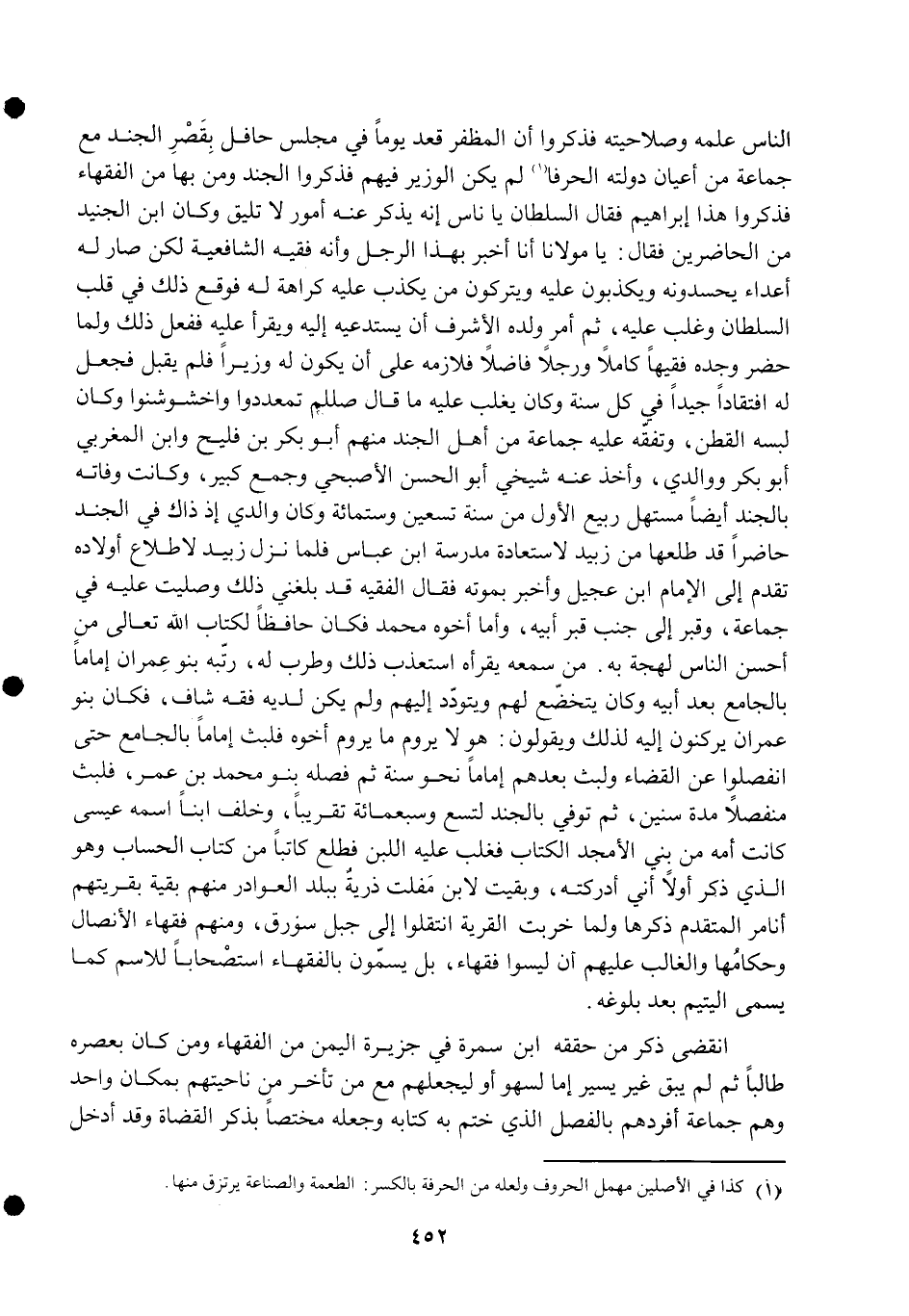 انْقَضى ذكر من حَقَّقَهُ ابْن سَمُرَة فِي جَزِيرَة الْيمن من الْفُقَهَاء وَمن كَانَ بعصره طَالبا ثمَّ لم يبْق غير يسير إِمَّا لسهو أَو ليجعلهم مَعَ من تَأَخّر من ناحيتهم بمَكَان وَاحِد وهم جمَاعَة أفردهم بِالْفَصْلِ الَّذِي ختم بِهِ كِتَابه وَجعله مُخْتَصًّا بذكرالقضاة وَقد أَدخل