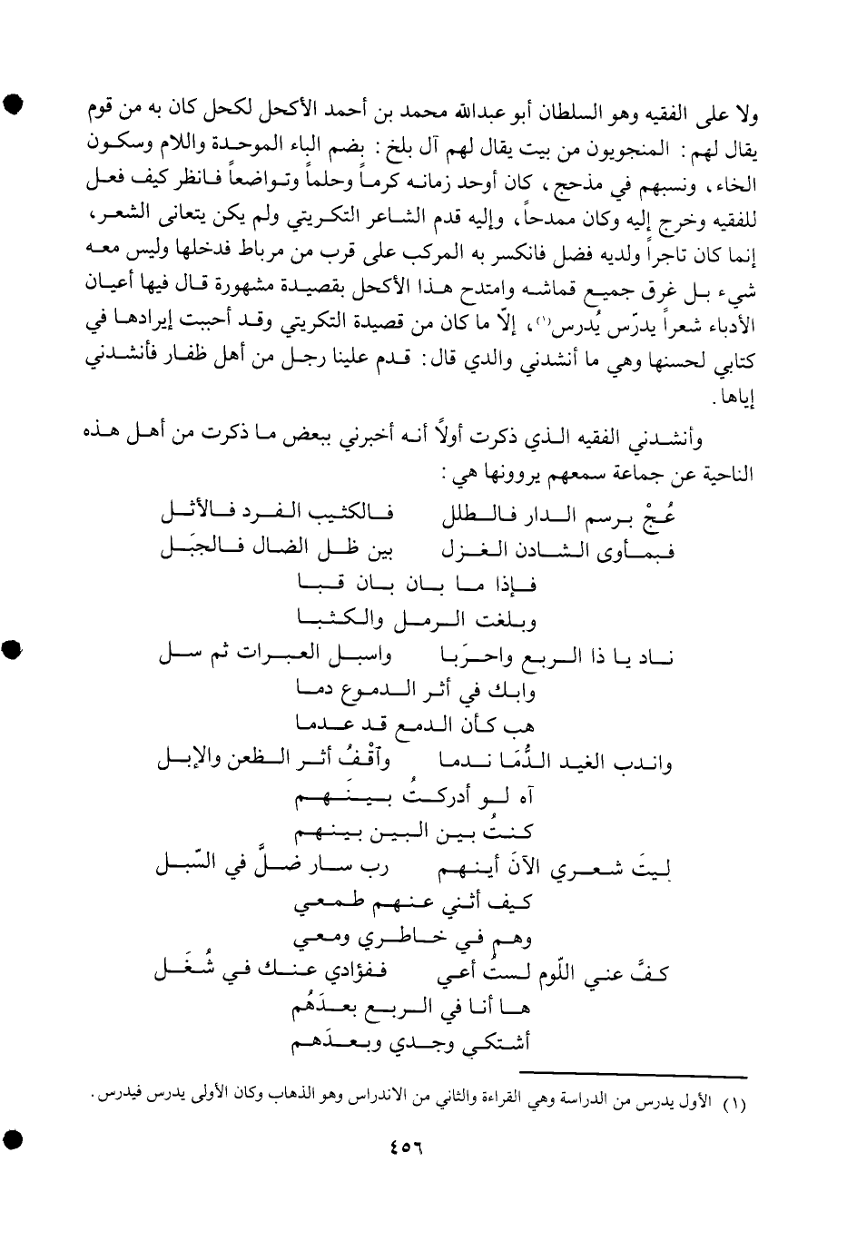 وأنشدني الْفَقِيه الَّذِي ذكرت أَولا أَنه أَخْبرنِي بِبَعْض مَا ذكرت من أهل هَذِه النَّاحِيَة عَن جمَاعَة سمعهم يروونها هِيَ ... عج برسم الدَّار فالطلل ... فالكثيب الْفَرد فالأثل