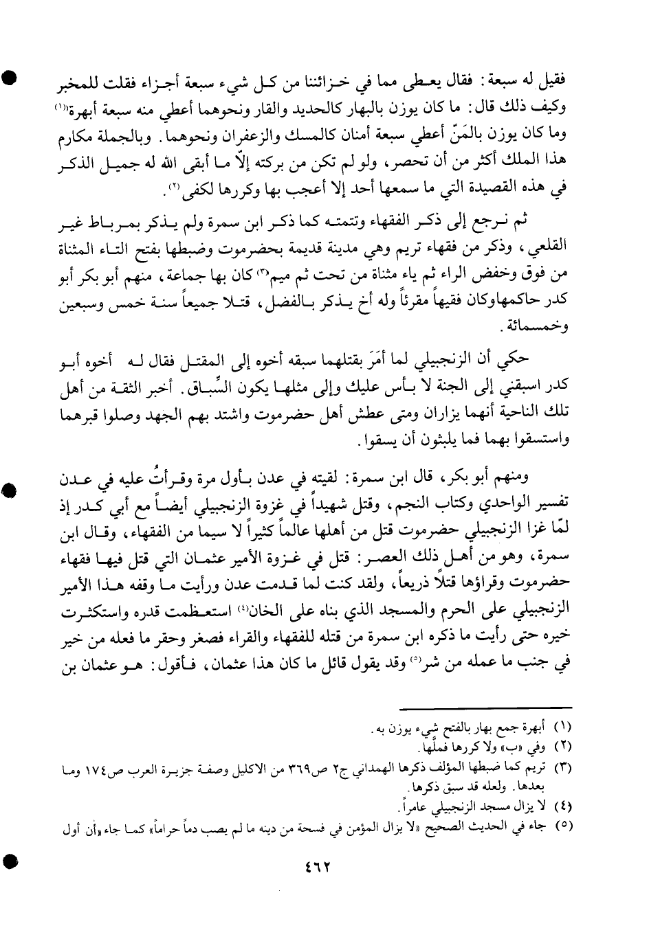وَمِنْهُم أَبُو بكر قَالَ ابْن سَمُرَة لَقيته فِي عدن بِأول مرّة وقرأت عَلَيْهِ فِي عدن تَفْسِير الواحدي وَكتاب النَّجْم وَقتل شَهِيدا فِي غَزْوَة الزنجبيلي أَيْضا مَعَ أبي كدر إِذْ لما غزا الزنجبيلي حضر موت قتل من أَهلهَا عَالما كثيرا لَا سِيمَا من الْفُقَهَاء وَقَالَ ابْن سَمُرَة وَهُوَ من أهل ذَلِك الْعَصْر قتل فِي غَزْوَة الْأَمِير عُثْمَان الَّتِي قتل فِيهَا فُقَهَاء حَضرمَوْت وقراؤها قتلا ذريعا وَلَقَد كنت لما قدمت عدن وَرَأَيْت مَا وَقفه هَذَا الْأَمِير الزنجبيلي على الْحرم وَالْمَسْجِد الَّذِي بناه على الخان استعظمت قدره واستكثرت خَيره حَتَّى رَأَيْت مَا ذكره ابْن سَمُرَة من قَتله للفقهاء والقراء فصغر وحقر مَا فعله من خير فِي جنب مَا عمله من شَرّ وَقد يَقُول قَائِل مَا كَانَ هَذَا عُثْمَان فَأَقُول هُوَ عُثْمَان بن