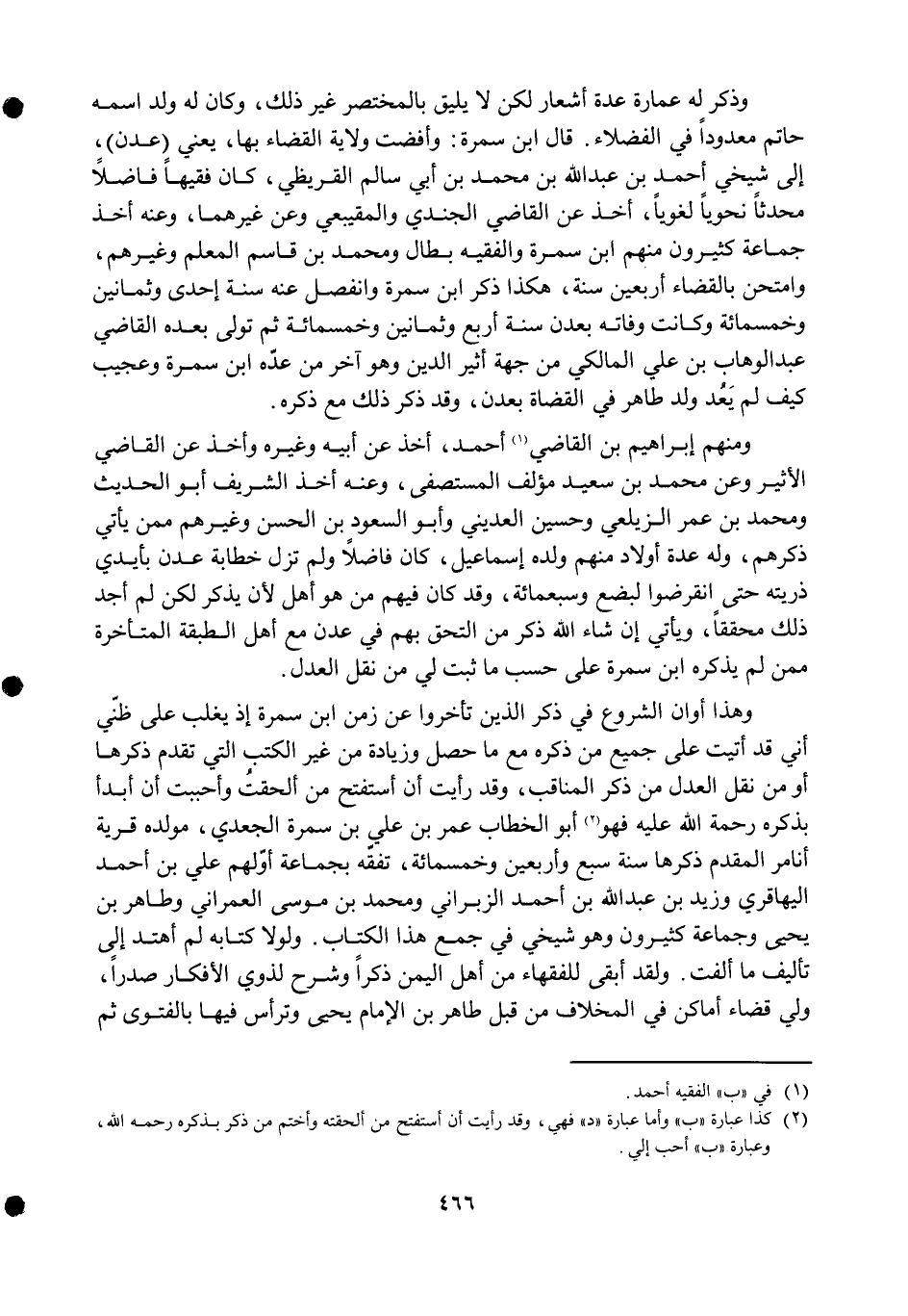 وَمِنْهُم إِبْرَاهِيم بن القَاضِي أَحْمد أَخذ عَن أَبِيه وَغَيره وَأخذ عَن القَاضِي الْأَثِير وَعَن مُحَمَّد بن سعيد مؤلف الْمُسْتَصْفى وَعنهُ أَخذ الشريف أَبُو الحَدِيث وَمُحَمّد بن عمر الزَّيْلَعِيّ وحسين العديني وَأَبُو السُّعُود بن الْحسن وَغَيرهم مِمَّن يَأْتِي ذكرهم وَله عدَّة أَوْلَاد مِنْهُم وَلَده إِسْمَاعِيل كَانَ فَاضلا وَلم تزل خطابة عدن بأيدي ذُريَّته حَتَّى انقرضوا لبضع وَسَبْعمائة وَقد كَانَ فيهم من هُوَ أهل لِأَن يذكر لَكِن لم أجد ذَلِك محققا وَيَأْتِي إِن شَاءَ الله ذكر من الْتحق بهم فِي عدن مَعَ أهل الطَّبَقَة الْمُتَأَخِّرَة مِمَّن لم يذكرهُ ابْن سَمُرَة على حسب مَا ثَبت لي من نقل الْعدْل
