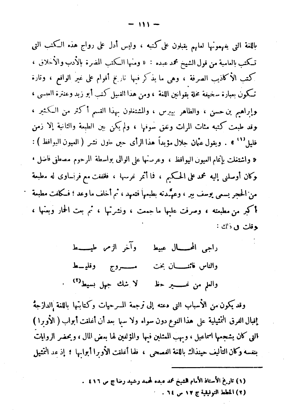 وكان عثمان جلال كثيرًا ما ينطق قبول وورد جنة بالشعر العربيّ الفصيح, مع اعترافه بأنها "لم يتعلما الكتابة ولا القراءة" بل نشأ على السذاجة والبراءة، فلا يفكران في أزمانٍ مضت، ولا ليالٍ انقضت، بل قام بعقولهما الصغيرة، أن الدنيا قد انحصرت في هذه الجزيرة، وأن لا لذة لهما فوق لذتهما، ولا شغل إلّا حب أمهاتهما"1.