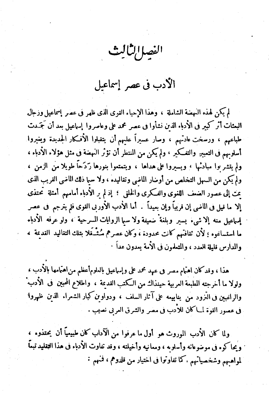 3- أدباء قويت شخصيتهم بعض الشيء، وحاولوا أن يجددوا، وأن يلونوا أدبهم بما يظهر نفسيتهم, ويطبعه بطابعهم، وقد نجحوا في ذلك أحيانًا، ولكنهم لم يستطيعوا أن يقاوموا سيطرة الأدب الموروث، ولا إغراء المحسنات، والزخارف، فضعفت هذه الشخصية، وتضاءلت أمام هذا الإغراء، فجاء أدبهم إبَّان هذا الضعف من نمط المدرسة الثانية، ومن هذه المدرسة: عبد الله فكري، تراه آنًا ينطلق على سجيته ولا يتقيد بهذه الصناعة السمجة المتكلفة في نثره، وبهذه الزخرفة اللفظية الممجوجة, فتتضح شخصيته وتنجلي فكرته، ويترسل في كتابته, فيفهم الناس منه ما يقول دون عناء، وهذا قليل في كتابته، وآنًا يجذبه ذلك الزخرف فيستعد ويهتم ويحتفي بموضوعه, ويبذل جهدًا شديدًا في صوغ العبارات، ويكاد هذا يطغى على شخصيته، وأكثر شعره ونثره من هذا الطراز.