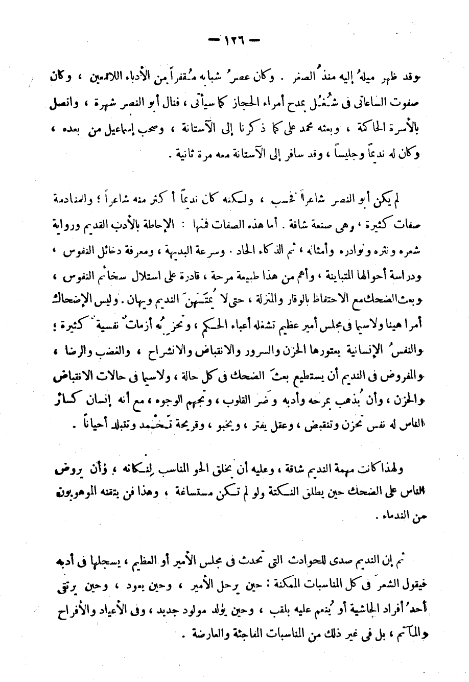 وشعر أبي النصر يمثِّلُ كذلك هذه المدرسة التي أثقل أدبها بأوضار القديم وآفاته، فهو مولع بالمحسنات البديعية، وبالتأريخ الشعري، وبالألغاز، وبالتشطير, والتلاعب بالألفاظ، والشعر في هذه المدرسة -كما ذكرنا- صناعة تظهر البراعة والقدرة على صياغةٍ معينةٍ تحقق غرضًا من هذه الأغراض, وليس ترجمانًا عن همسات القلوب، وأشجان النفوس وأحاديثها، ومطية للخيال يحلق في سماواته الواسعة، أو مفصحًا عن فكرة اختمرت في عقل الشاعر وأبت إلّا أن تظهر جليةً واضحةً, كما يجب أن يكون الشعر.
