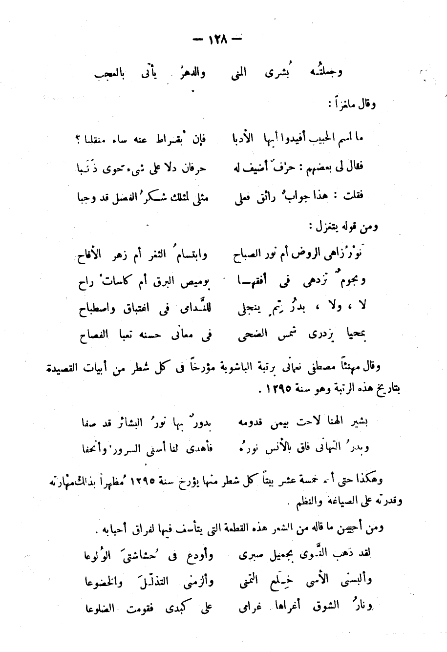 وفي هذه النماذج التي سقناها من شعره يتبين مدى ما ذكرناه عن أدباء هذه المدرسة وتقليدهم, وعدم ظهور شخصيتهم، مع افتتانهم بالبديع والجري وراءه، وضعف أسلوبهم، وقد مات سنة 1880، وله ديوان مطبوع.