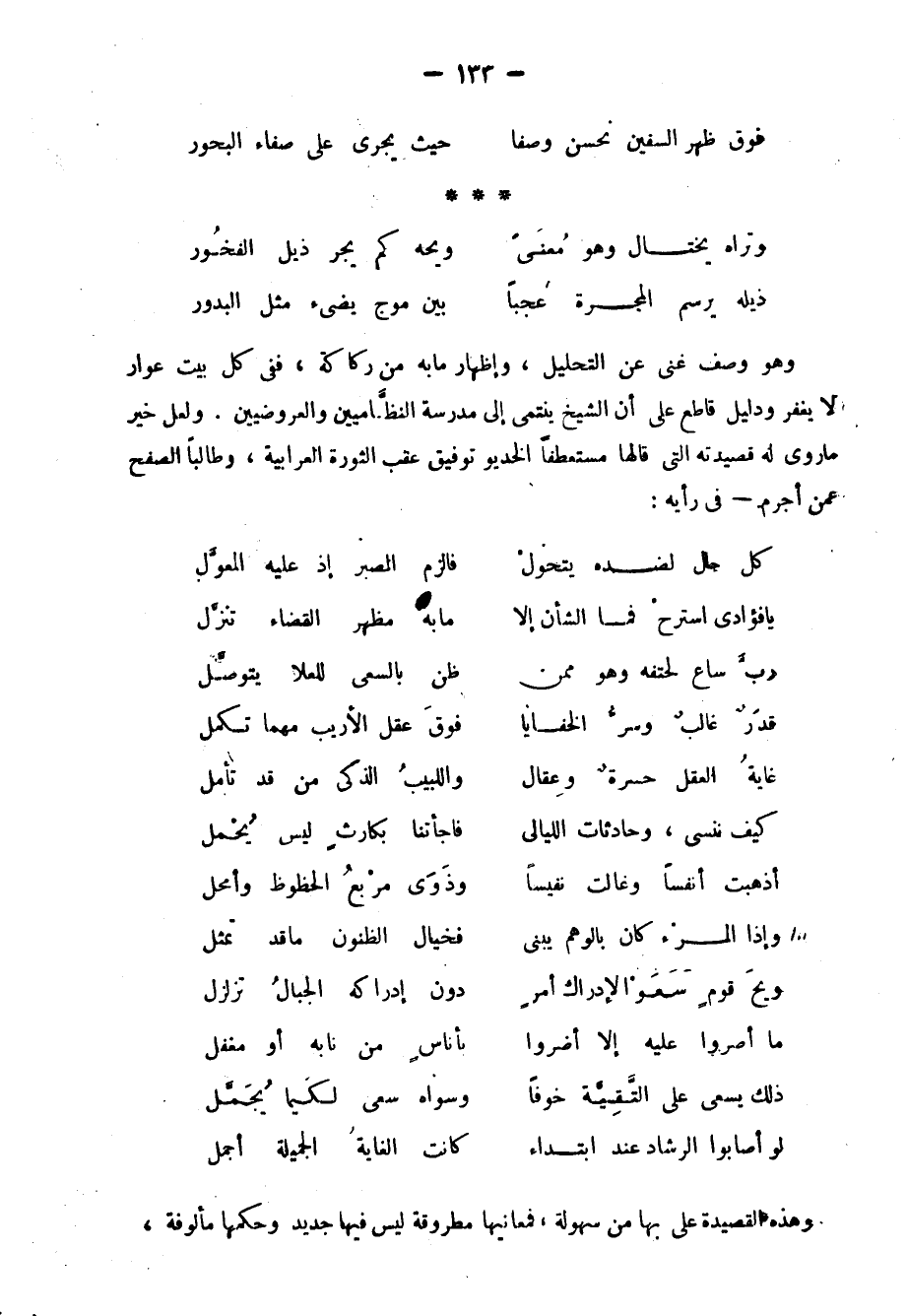 وهاك مثلًا لشاعرٍ استطاع بمواهبه أن يفصح عن شخصيته، وإن تراءت من بعيدٍ حائلة اللون، غير واضحة المعالم، تحاول جهدها أن تظهر من خلال هذه السدف الغليظة من التقاليد الموروثة في الشعر العربيّ, ولا سيما عصور الركة والانحلال, وقد أوتي حظًّا من اللسن والفصاحة فاستطاع أن يجيد في غير ما موضع من شعره، حتى ليعده بعضهم طليعةً للنهضة الحديثة، وممهدًا للطريق الذي سلكه الباردوي من بعد.