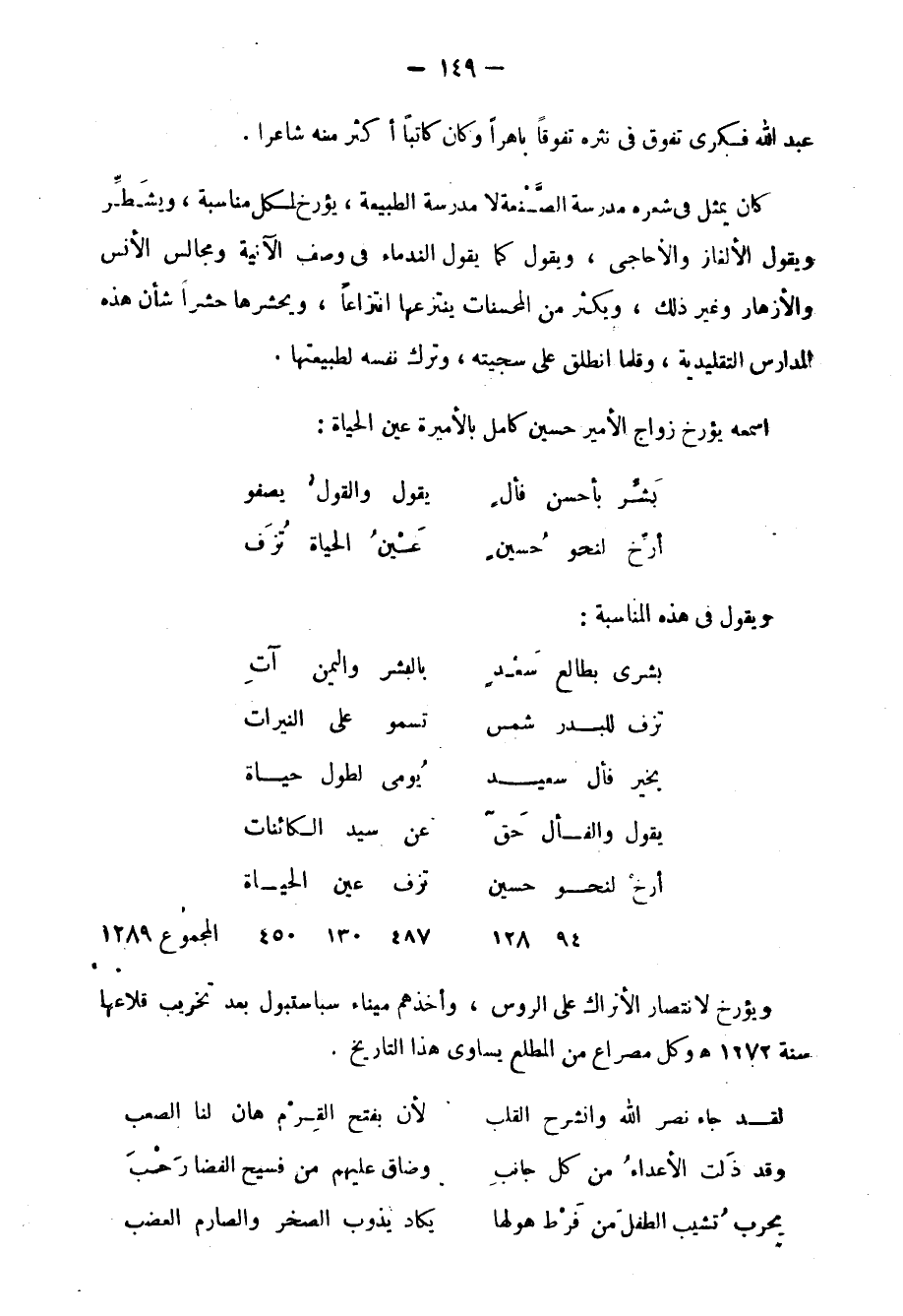 وهاك مثلًا آخر يقلد فيه القدماء في معانيهم وأخليتهم, بما لا يناسب قاهريته وحضارته، فتشبيهاتٌ قديمة، وخيالٌ سخيفٌ، وديباجة ضعيفة، وجري وراء المحسنات، وموضوع هذه القصيدة المديح، وقد ابتدأها بالنسيب كما كان يفعل القدماء قال: