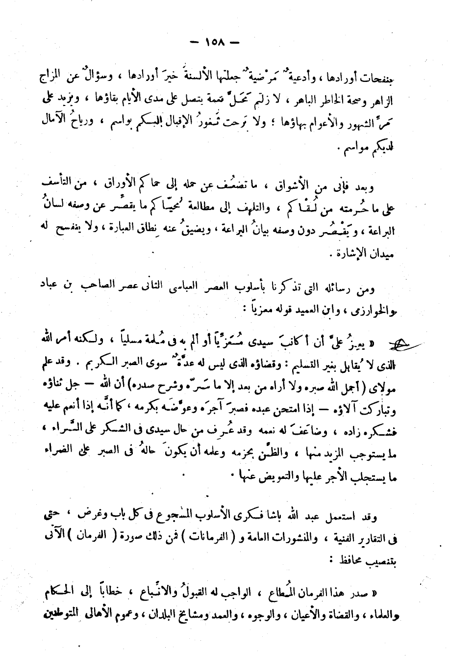 ومن الأسلوب المرسل الذي تأثر فيه رجال الصحافة لعهده، ولا سيما أسلوب الجوائب, قوله من رسالة بعث بها إلى المرحوم عبد الله أبي السعود صاحب جريدة "وادي النيل":