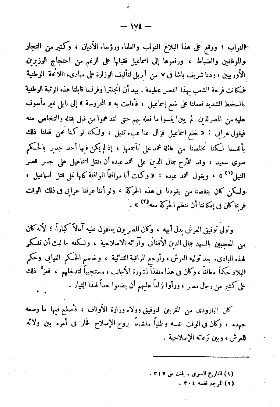 ثم كانت حركة الجيش، والمطالبة بتولية المصريين المناصب العليا، وقد كانت قبل وقفًا على الجراكسة والأتراك، وكانوا في منتهى الغلظة والقسوة، فثار الجيش في أوائل سنة 1881، حين أصدر عثمان وفقي الجركسي وزير الحربية أمرًا بعدم ترقية المصريين، وبفصل بعض ضباط المتزعمين فيهم، وانتهى الأمر بعزل عثمان رفقي هذا, وإجابة الجيش إلى ما طلب من إصلاح, وتولية البارودي وزارة الحربية مع الأوقاف، وهدأت الأمور في الظاهر، ولكن الجراكسة كانوا يدبرون مكيدةً للضباط المصريين، وتأزمت الأمور, فكانت مظاهرة عابدين في 9 من سبتمبر 1881, يتقدمها "عرابي" وكبار الضباط المصريين، وأطلَّ عليهم توفيق، ومعه وزراؤه وحاشيته وقناصل الدول الأجنبية، وتَقَدَّمَ عرابي إليه بطلبات الجيش والأمة، وهي إسقاط وزارة رياض, وتشكيل مجلس النواب, وزيادة عدد الجيش، وبعد مناقشاتٍ طويلةٍ حادةٍ, تقرر إجابة هذه الطلبات.