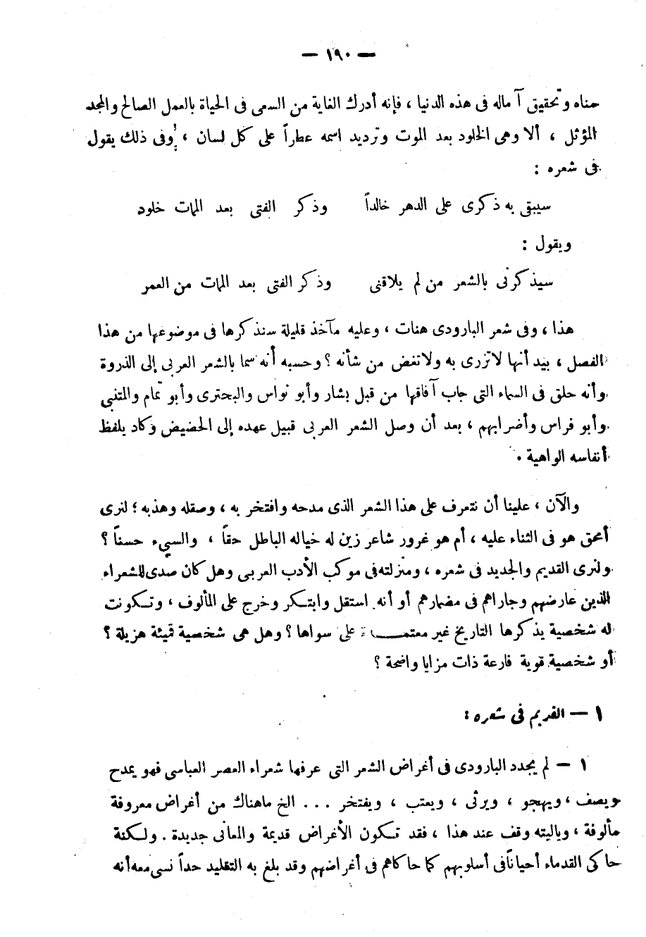 هذا، وفي شعر البارودي هنات، وعليه مآخذ قليلة, سنذكرها في موضعها من هذا الفصل، بيد أنها تزري به ولا تغض من شأنه؟ حسبه أنه سما بالشعر العربيّ إلى الذروة، وأنه حلَّق في السماء التي جاب آفاقها من قبل بشار وأبو نواس والبحتريّ وأبو تمام والمتنبي وأبو فراس وأضرابهم، بعد أن وصل الشعر العربيّ قبيل عهده إلى الحضيض, وكاد يلفظ أنفاسه الواهية.