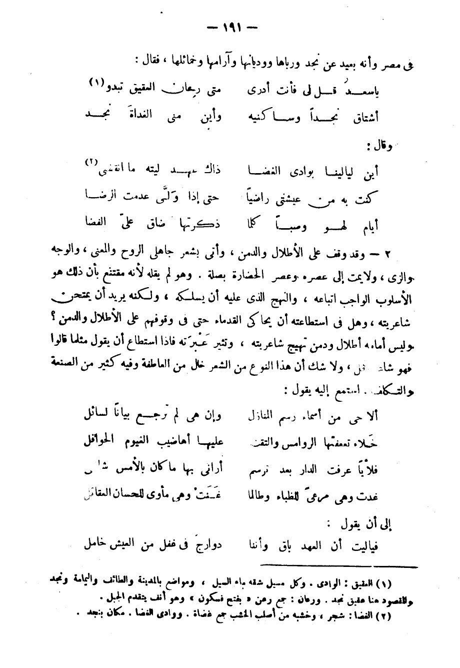 2- وقد وقف على الأطلال والدمن، وأتى بشعر جاهليّ الروح والمعنى، والوجه والزيّ، ولا يمتُّ إلى عصره وعصر الحضارة بصلة، وهو لم يقله لأنه مقتنع بأن ذلك هو الأسلوب الواجب اتباعه، والنهج الذي عليه أن يسلكه، ولكنه يريد أن يمتحن شاعريته، وهل في استطاعته أن يحاكي القدماء حتى وقوفهم على الأطلال والدمن؟ وليس أمامه أطلال ودمن تهيج شاعريته، وتثير عبرته, فإذا استطاع أن يقول مثلما قالوا فهو شاعر فحل، ولا شكَّ أن هذا النوع من الشعر خالٍ من العاطفة, وفيه كثير من الصنعة والتكلف، استمع إليه يقول: