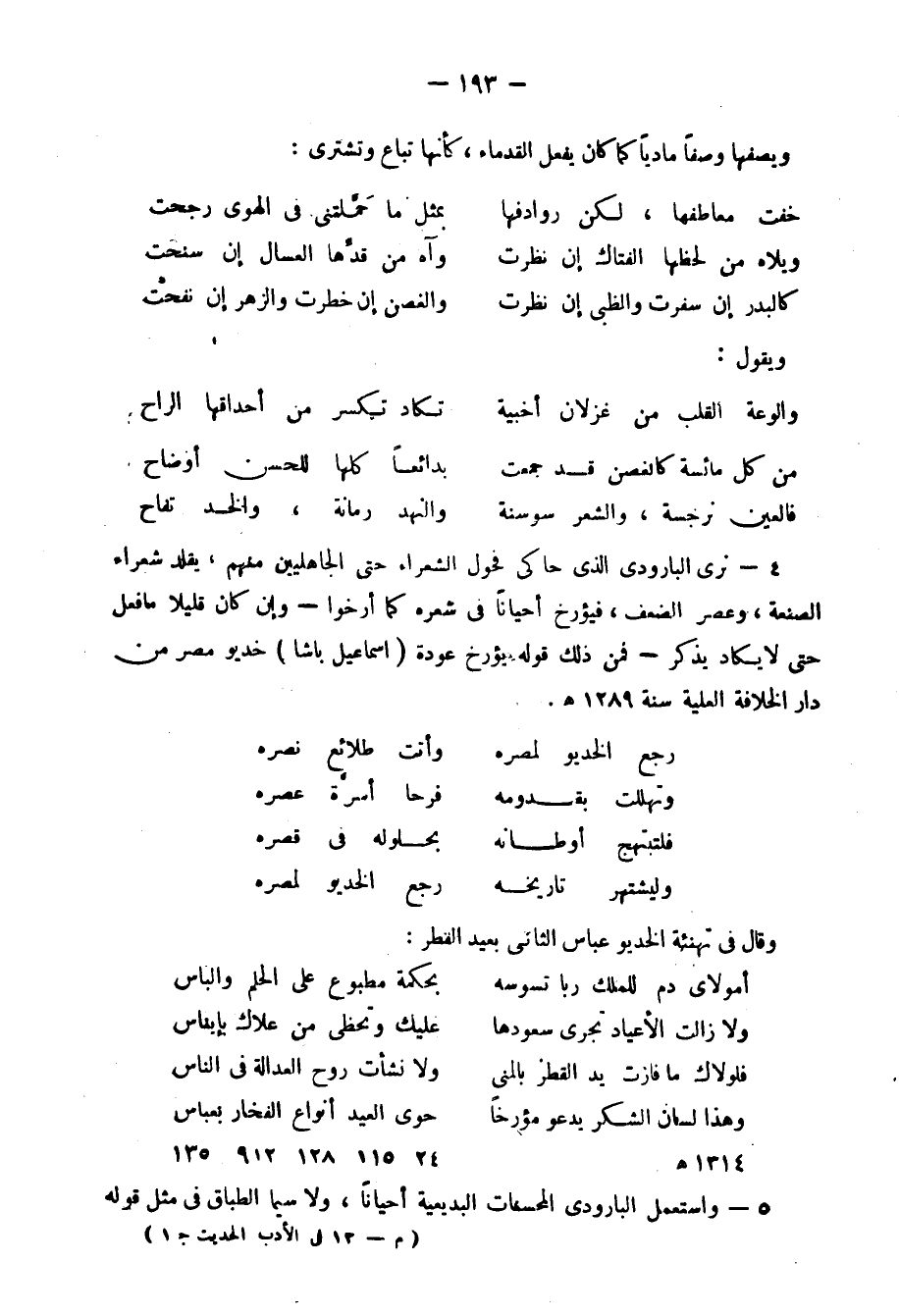 4- نرى البارودي الذي حاكى فحول الشعراء حتى الجاهليين منهم، يقلد شعراء الصنعة، وعصر الضعف، فيؤرخ أحيانًا في شعره كما أرخوا -وإن كان قليلًا ما فعل حتى لا يكاد يذكر- فمن ذلك قوله يؤرخ عودة "إسماعيل باشا" خديو مصر من دار الخلافة العلية سنة 1289هـ.