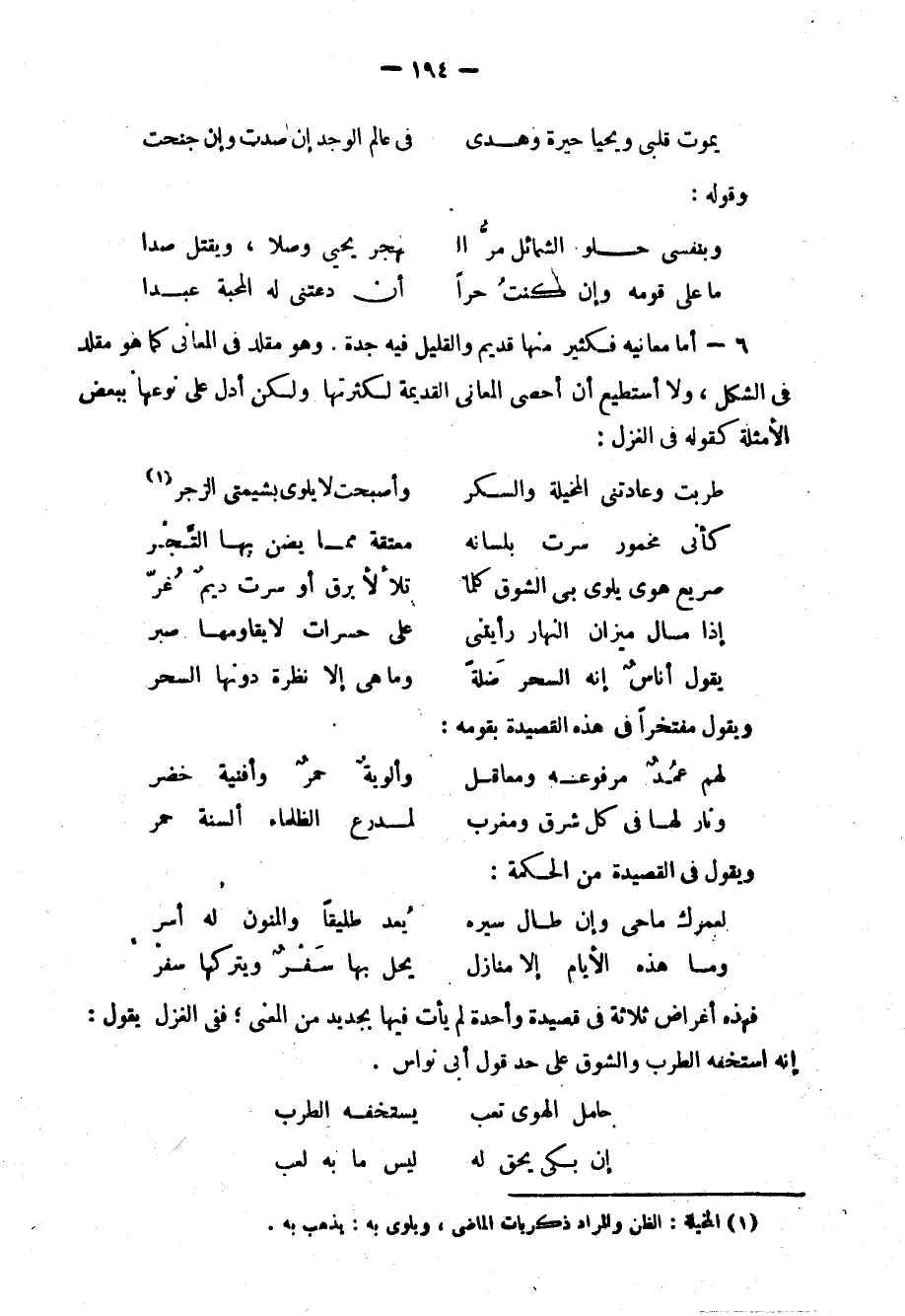 6- أما معانيه فكثير منها قديم, والقليل فيه جدة, وهو مقلِّدٌ في المعاني كما هو مقلد في الشكل، ولا أستطيع أن أحصي المعاني القديمة لكثرتها, ولكن أدل على نوعها ببعض الأمثلة كقوله في الغزل: