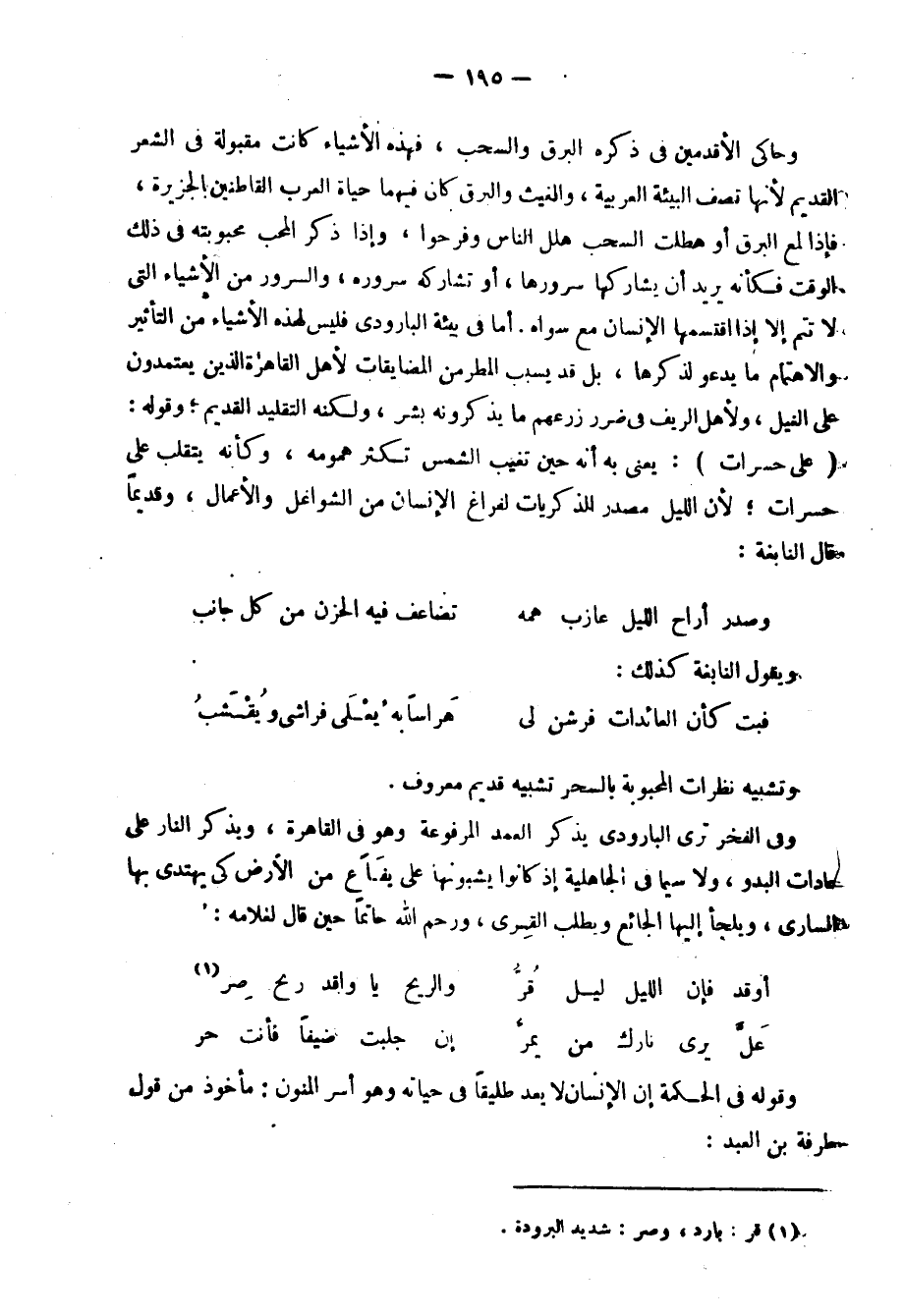 وفي الفخر ترى البارودي يذكر العمد المرفوعة وهو في القاهرة، ويذكر النار على عادات البدو، ولا سيما في الجاهلية إذا كانوا يشبونها على يفاعٍ من الأرضي كي يهتدي بها الساري، ويلجأ إليها الجائع ويطلب القرى، ورحم الله حاتمًا حين قال لغلامه: