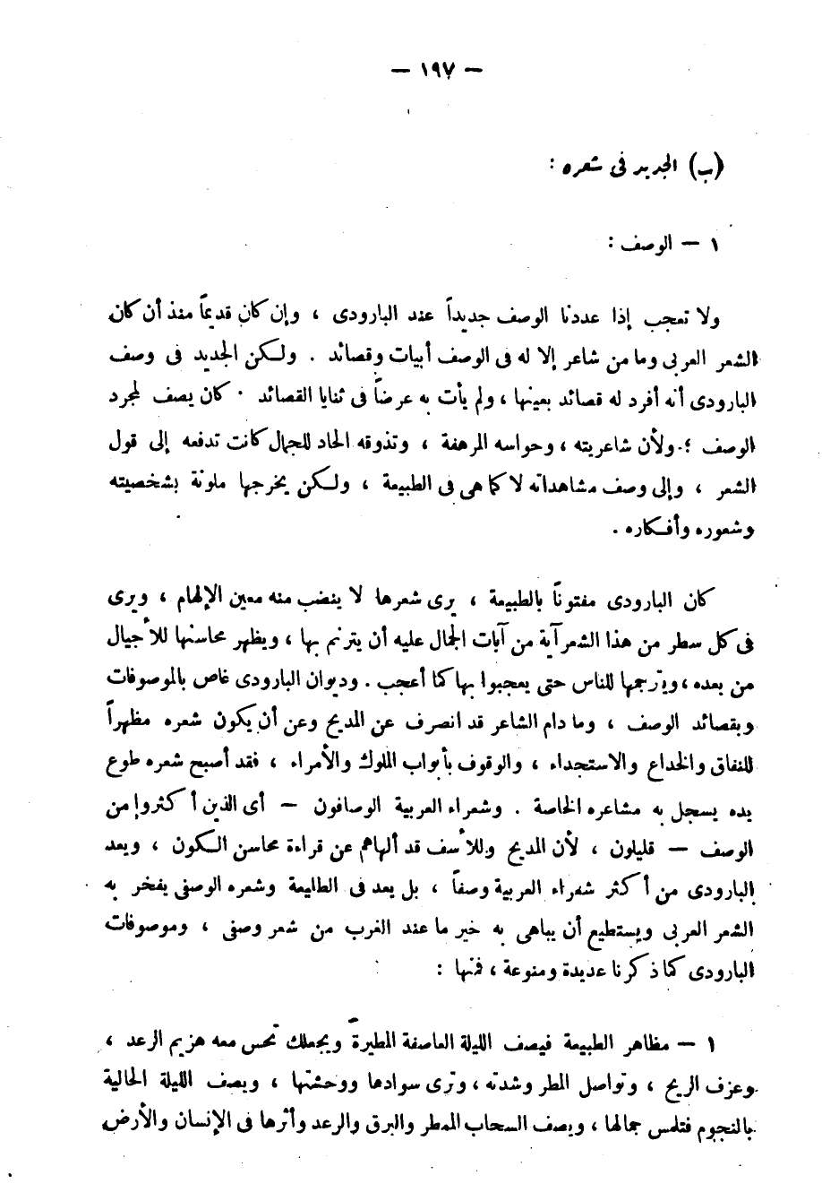 كان البارودي مفتونًا بالطبيعة, يرى شعرها لا ينضب منه معين الإلهام، ويرى في كل سطرٍ من هذا الشعر آيةً من آيات الجمال عليه أن يترنَّمَ بها، ويظهر محاسنها للأجيال من بعده، ويترجمها للناس حتى يعجبوا بها كما أعجب.