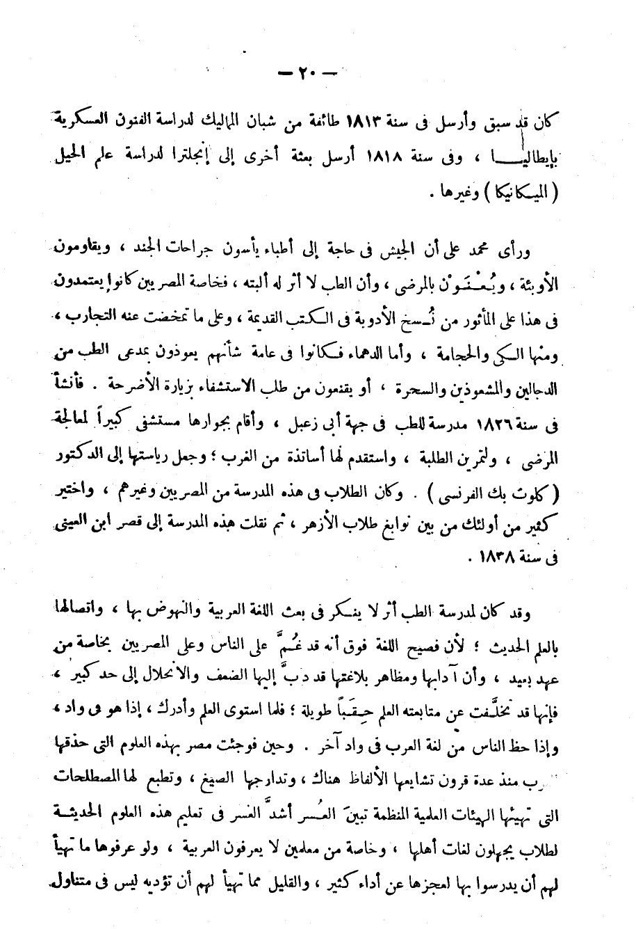 وقد وجد محمد علي أن خير وسيلةٍ تنهض بالشعب المصريّ وترفعه إلى مستوى الأمم الناهضة, الاهتمام بالتعليم، وقد سلك في سبيل تعليم الشعب كلَّ الطرق الناجحة: فمن بعثاتٍ وطباعةٍ، وفتح مدارس، ونقل آثار الأمم الغربية في العلوم والآداب، وتأسيس الصحافة لتنير الحياة أمام الشعب.