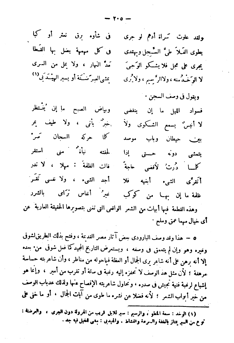 5- وهذا وقد وصف البارودي بعض آثار مصر القديمة، وفتح بذلك الطريق لشوقي وغيره، وهو وإن لم يتعمق في وصفه، ويستعرض التاريخ المجيد كما أفعل شوقي من بعده, إلّا أنه برهنَ على أنه شاعر يرى الجمال والعظة فيما حوله من مناظر، وأن شاعريته حساسة مرهفة؛ لأن مثل هذا الوصف لا تحفزه إليه رغبة في صلة, أو تَقَرُّبٌ من أمير، وإنما هو إشباعٌ لرغبةٍ فنيةٍ تجيش في صدره, وتحاول شاعريته الإفصاح عنها، ولذلك عد باب الوصف من خير أبواب الشعر؛ لأنه فضلًا عن نشره ما طوى من آيات الجمال، أو ما خفي على عيون الناس منها, فإنه يدل على نفسية الشاعر، وقدرته وخياله، وهو خير محكٍّ للتمييز بين الشعراء، ومن ذلك قوله يصف الهرمين: