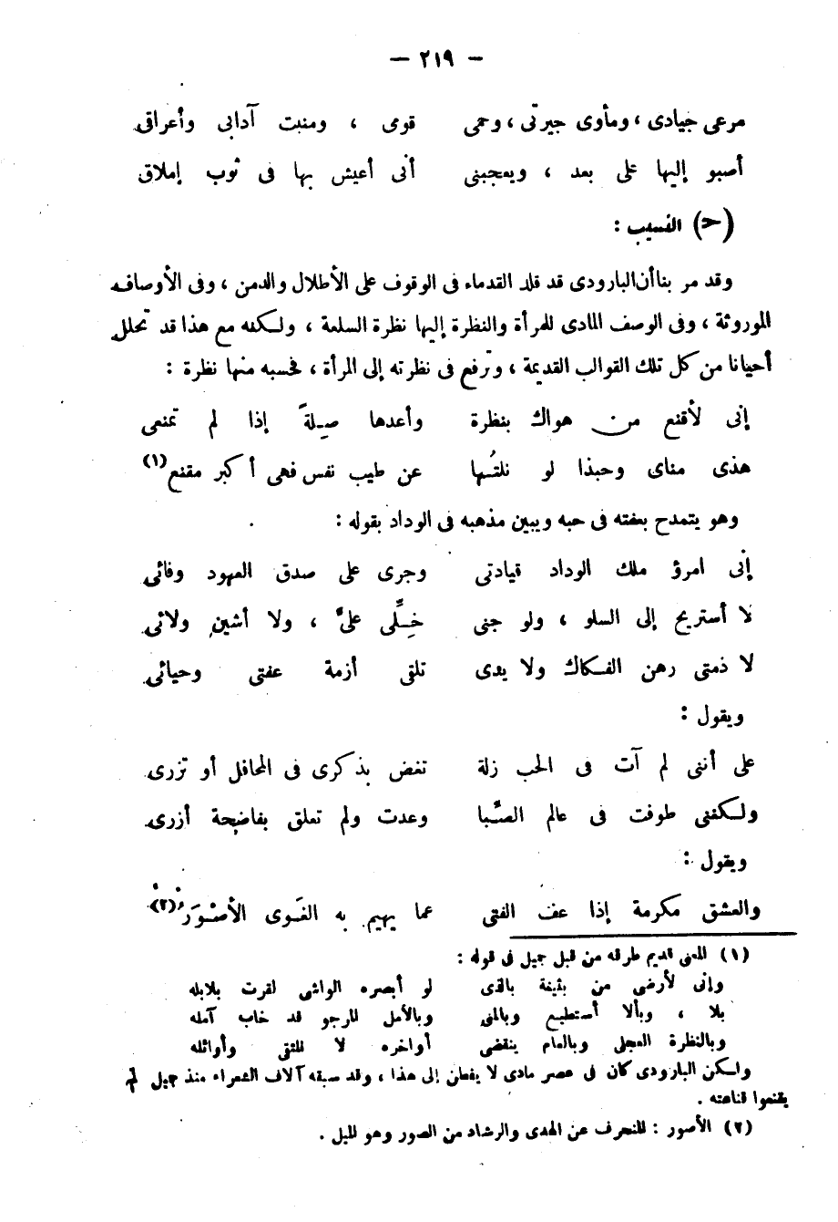 وقد مَرَّ بنا أن البارودي قد قلَّدَ القدماء في الوقوف على الأطلال والدمن، وفي الأوصاف الموروثة، وفي الوصف الماديِّ للمرأة والنظرة إليها نظرة السلعة، ولكنه مع هذا قد تحلَّلَ أحيانًا من كل تلك القوالب القديمة، وترَفَّعَ في نظرته إلى المرأة، فحسبه منها نظرة: