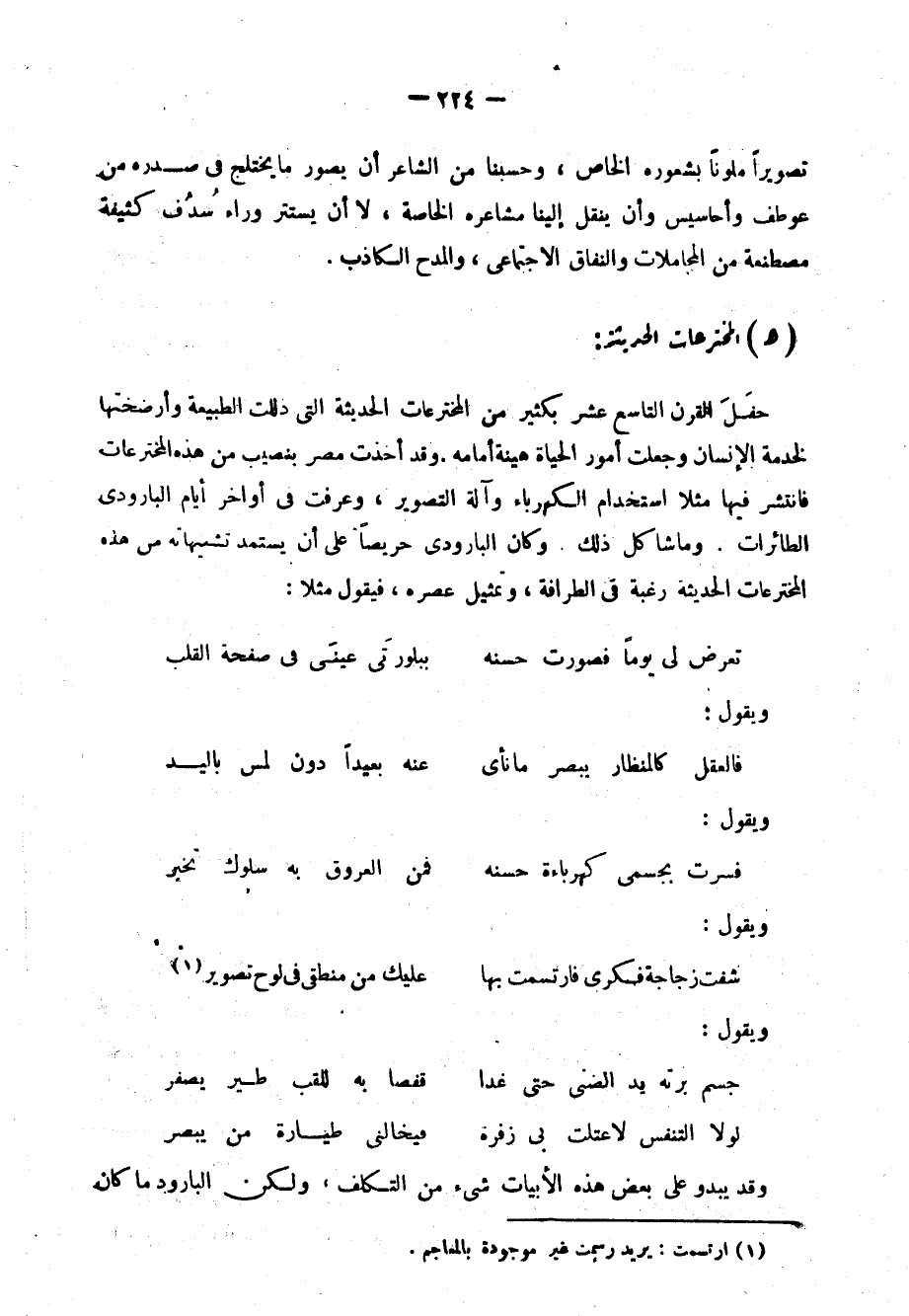 حفل القرن التاسع عشر بكثيرٍ من المخترعات الحديثة التي ذللت الطبيعة وأرضختها لخدمة الإنسان, وجعلت أمور الحياة هينةً أمامه, وقد أخذت مصر بنصيبٍ من هذه المخترعات, فانتشر فيها مثلًا استخدام الكهرباء وآلة التصوير، وعرفت في أواخر أيام البارودي الطائرات، وما شاكل ذلك، وكان البارودي حريصًا على أن يستمد تشبيهاته من هذه المخترعات الحديثة رغبةً في الطرافة، وتمثيل عصره، فيقول مثلًا: