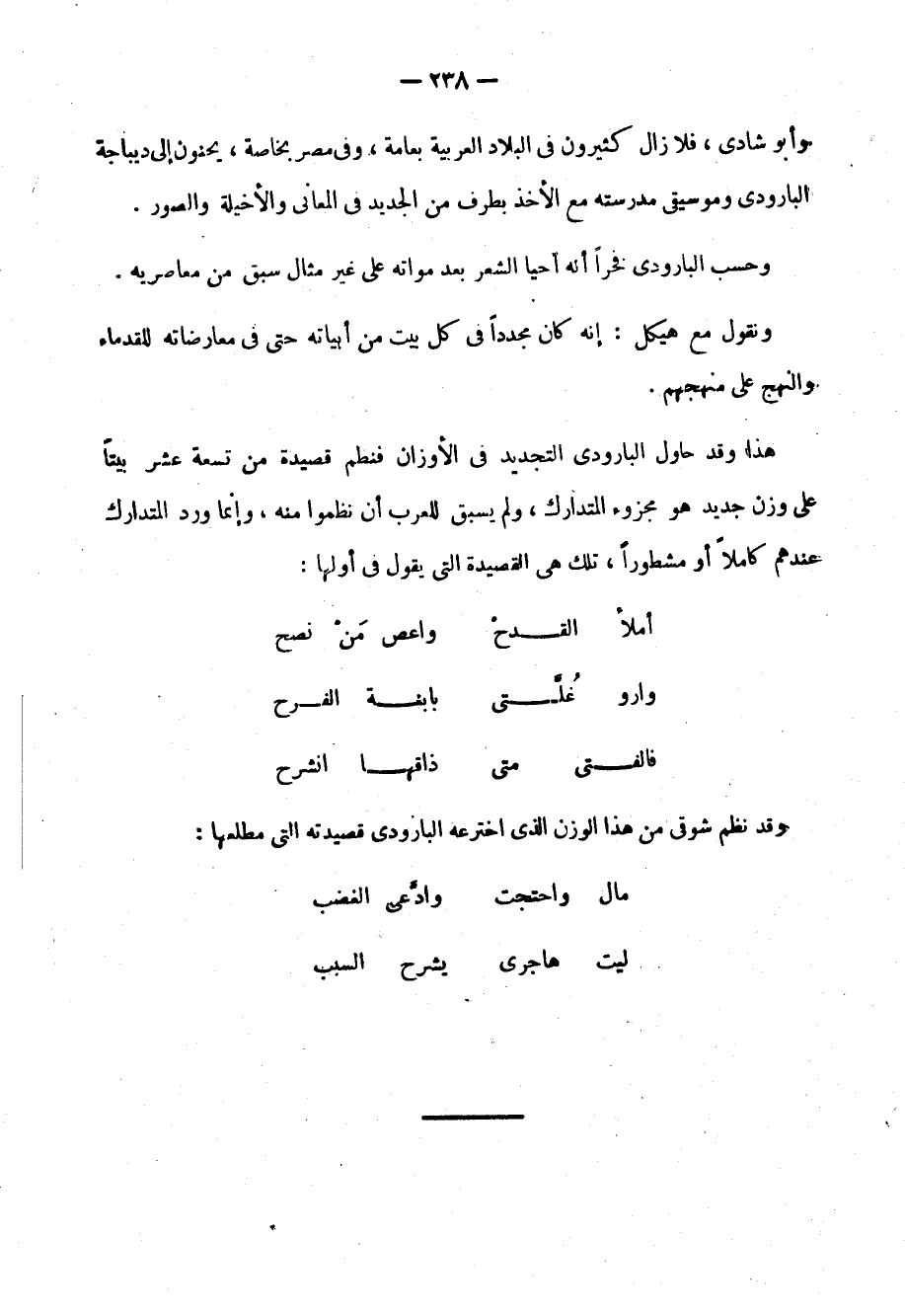 مصر بخاصة، يحنون إلى ديباجة البارودي وموسيقى مدرسته, مع الأخذ بطرفٍ من التجديد في المعاني والأخيلة والصور.