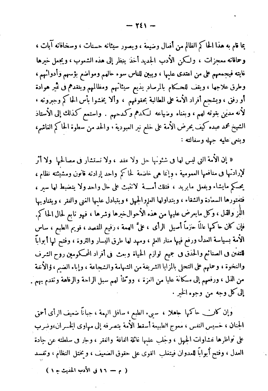1- الدافع عن الشعوب المظلومة التي ظلت تئن تحت نير العبودية والعسف قرونًا مديدة، لا تعرف كيف تراجع الحاكم في حكمٍ أبرمه ولو كان ظالمًا، ولا كيف تثور وتشكو وتئن وتتوجع وتسمع شكاتها للعالم، والحاكم سادر في غلوائه، يمتص دماءها، ويسخرها لأهوائه وشهواته؛ ولا يفكر في نفعها إلا بمقدار ما يعود عليه من الفائدة، استمع للأستاذ الإمام محمد عبده كيف يصور لك حال مصر قبل أن يشيع هذا الأدب الجديد والفكر الجرئ في أرجائها.