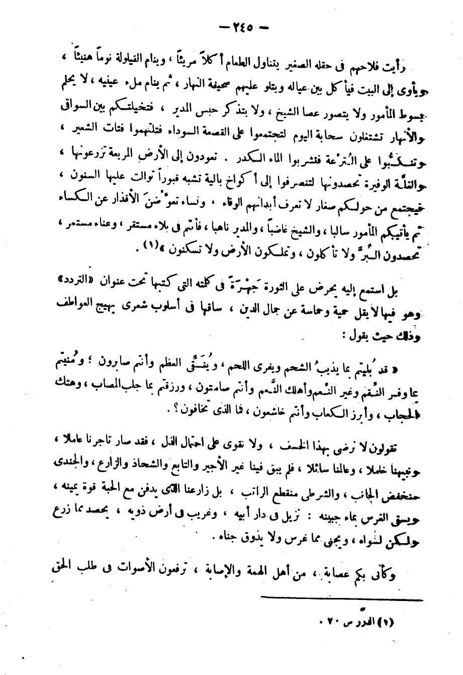 "أنت أيها الفلاح المسكين, تشق قلب الأرض لتستنبت منها ما تسد به الرمق، وتقوم بأود العيال، فلماذا لا تشق قلب ظالمك؟ لماذا لا تشق قلب الذين يأكلون ثمرة أتعابك"2.