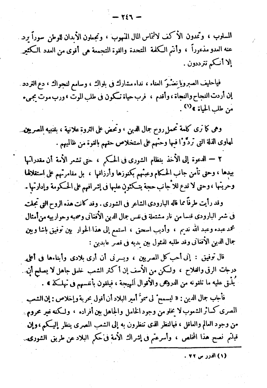 رأيت فلاحهم في حقله الصغير, يتناول الطعام أكلًا مريئًا, وينام القيلولة نومًا هنيئًا، يأوي إلى البيت فيأكل بين عياله, ويتلو عليهم صحيفة النهار, ثم ينام ملء عينيه، لا يحلم بسوط المأمور ولا يتصور عصا الشيخ، ولا يتذكر حبس المدير، فتخيلتكم بين السواقي والأنهار تشتغلون سحابة اليوم؛ لتجتمعوا على القصعة السواداء فتلتهموا فتات الشعير، وتنكبوا على الترعة فتشربوا الماء الكدر، تعودون إلى الأرض المريعة تزرعونها، والغلة الوفيرة تحصدونها، لتنصرفوا إلى أكواخٍ باليةٍ تشبه قبورًا توالت عليها السنون، فيجتمع من حولكم الصغار لا تعرف أبدانهم الوقاء، ونساء تعوضن الأقذار عن الكساء، ثم يأتيكم المأمور سالبًا، والشيخ غاضبًا، والمدير ناهبًا، فأنتم في بلاءٍ مستقرٍّ، وعناء مستمرٍّ، وتحصدون البُرَّ ولا تأكلون، وتملكون الأرض ولا تسكنون"1.