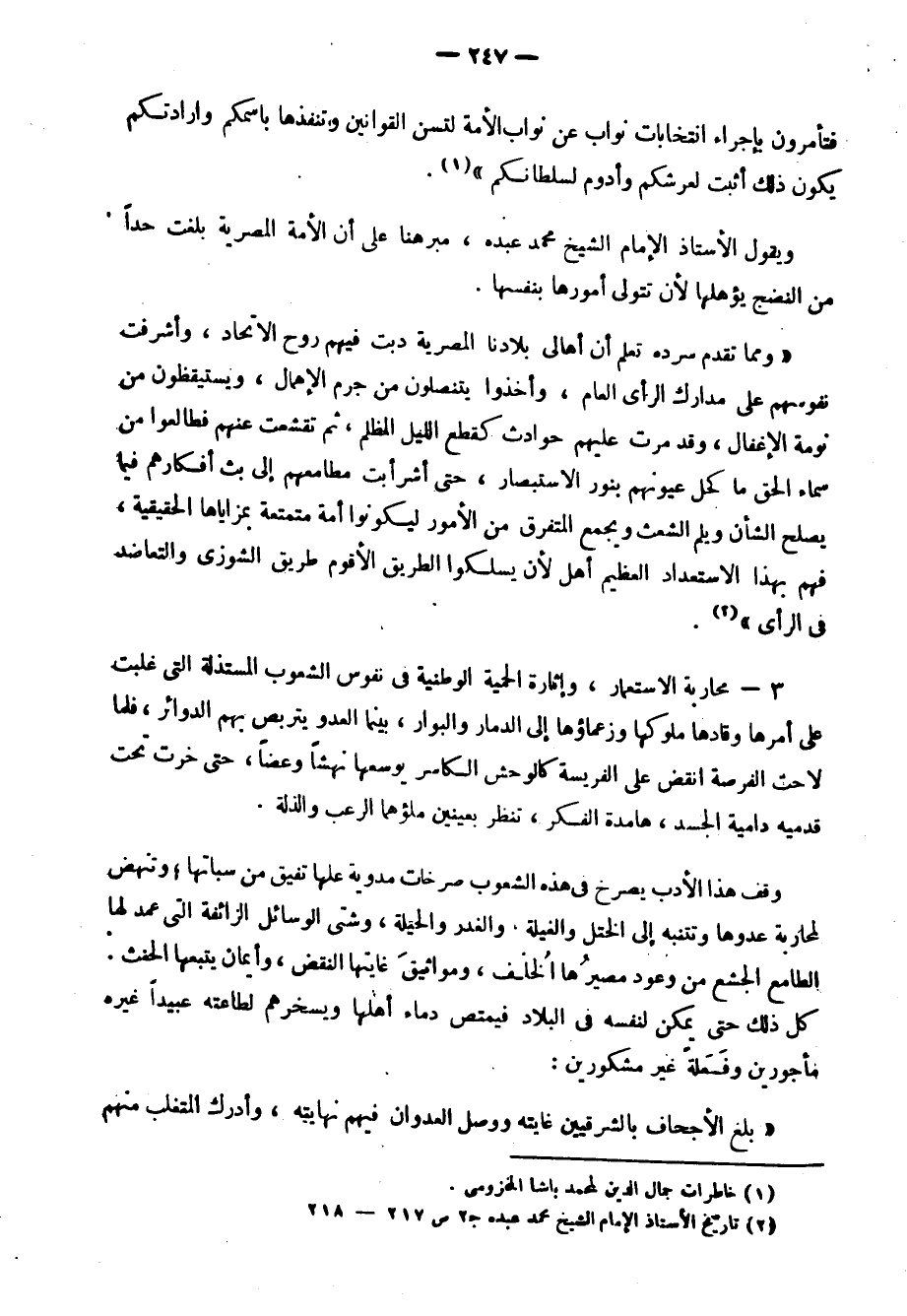 تقولون: لا نرضى بهذ الخسف، ولا نقوى على احتمال الذل، فقد صار تاجرنا عاملًا، ونبيهنا خاملًا، وعالمنا سائلًا، فلم يبق فينا غير الأجير والتابع والشحاذ والزارع، والجندي منخفض الجانب، والشرطيّ منقطع الراتب، بل زارعنا الذي يدفن مع الحبة قوة يمينه، ويسقي الغرس بماء جبينه, نزيلٌ في دار أبيه، وغريب في أرض ذويه، يحصد مما زرع ولكن لسواه، ويجني مما غرس ولا يذوق جناه.