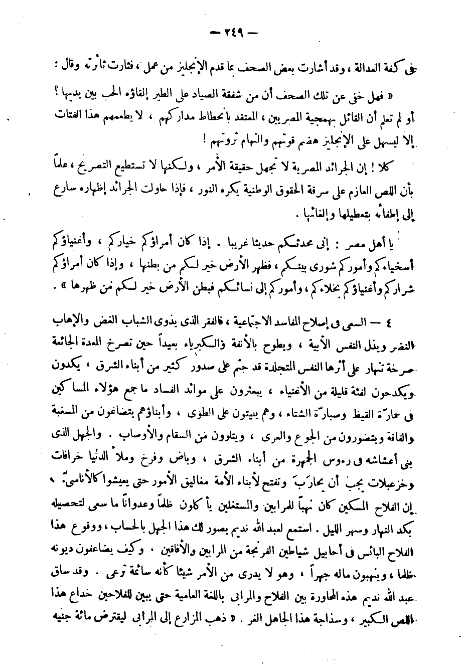 "بلغ الإجحاف بالشرقيين غايته, ووصل العدوان فيهم نهايته، وأدرك المتغلب منهم نكايته، وخصوصًا في المسلمين منهم، فملوك أنزلوا عن عورشهم جورًا، وذوو حقوق في الإمرة حُرِمُوا حقوقهم ظلمًا، وأعزَّاء باتوا أذلاء، وأجلاء أصبحوا حقراء، وأغنياء أمسوا فقراء، وأصحَّاء أضحوا سقامًا، وأسود تحولت نعامًا، ولم تبق طبقة من الطبقات إلّا وقد مسَّها الضر من إفراط الطامعين في أطماعهم، خصوصًا من جراء هذه الحوادث التي بذرت بذورها الأراضي المصرية نحو