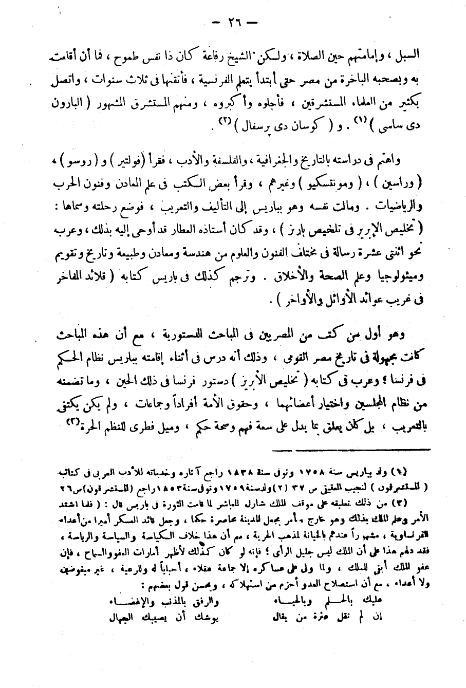 ولم يكن مطلوبًا من إمام البعثة أن يحصِّلَ شيئًا من علوم الفرنسيين، ولكن حسبه أن يؤدي مهمته من وعظ الطلاب وإرشادهم إلى ما فيه خيرهم، ونصحهم إذا ضلت بهم السبل، وإمامتهم حين الصلاة، ولكن الشيخ رفاعة كان ذا نفسٍ طموح، فما أن أقامت به وبصحبه الباخرة من مصر حتى ابتدأ يتعلم؛ فأجلُّوه وأَكْبَرُوه، ومنهم المستشرق المشهور "البارون دي ساسي"2. "كوسان دي برسفال"3.