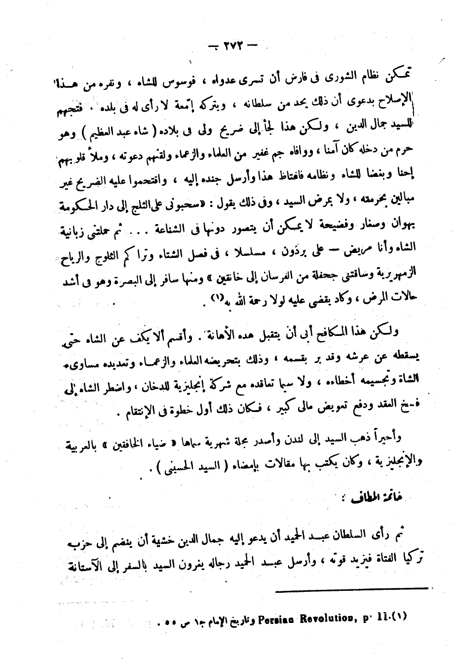 لما عطلت الجريدة، وانفرط عقد هذه الجماعة الصغيرة المجاهدة، ورجع الشيخ محمد عبده وميزرا باقر إلى بيروت، وطلب شاه العجم السيد جمال الدين فلَبَّى دعوته علَّه يجد ميدانًا صالحًا للجهاد، وأرضًا خصبةً لغرس تعاليمه، ومَلِكًا شهمًا مستنيرًا ينفذ آراءه, فيكون هو الأمل المنشود، ولكن هيهات وملوك ذاك الزمان ما ألفوا أن يشاركهم في سلطانهم أن جاههم أحدٌ، ولذلك سئم الشاه "نصر الدين" صحبة السيد، ودبت في نفسه الغيرة منه، ولما أحسَّ جمال الدين أنه أخذ