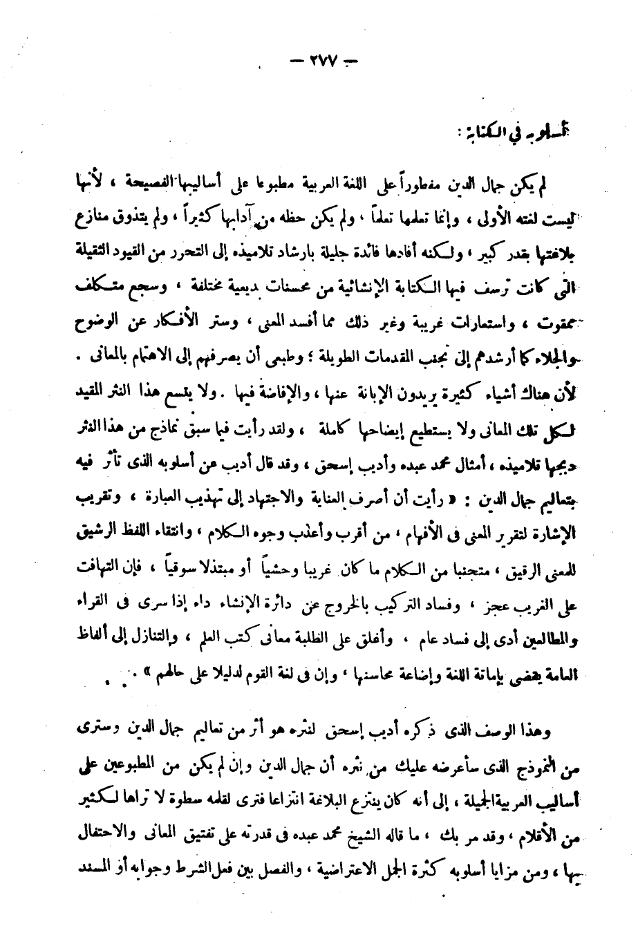 وكان جمال الدين يعتز بشرقيته وبلغته، ويشمئز من هؤلاء الذي يتنكرون لقوميتهم ولغتهم؛ فإن هذا التنكر يساعد المستعمر, بل هو أثر من آثار تعاليمه يرمي بها إلى الحطِّ من شأن كل ما هو شرقيّ, ولإضعاف لغة القوم، والتدرج بقتل التعليم القوميّ، وتنشيط القائلين من الشرقيين بأن ليس في لسانهم العربيّ أو الفارسيّ أوالأرديّ أو الهنديّ آداب تؤثر، ولا في تاريخهم مجد يذكر": لقد بلغ ببعضهم السفه "أن ينفروا من سماع لغتهم، وأن يتتباهوا بأنهم لا يحسنون التعبير بها، وأن ما تعلموه من الرطانة الأعجمية هي منتهى ما يمكن الوصول إليه من المدركات البشرية".