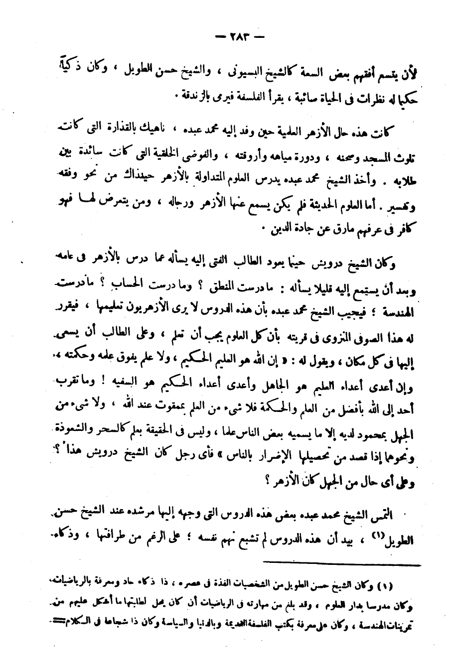 وتحول الشيخ محمد عبده من الجامع الأحمديّ إلى الأزهر، وكان الأزهر في ذلك الوقت على حالة من الفساد لا تطاق، وبحسبك أن تقرأ تقريرًا وضعه الشيخ عبد الكريم سلمان1 عن هذا المعهد وحال أساتذته وطلبته، ومدة الدراسة فيه2 وحال العلم، فإن الكتب التي كانت تدرس به من نتاج العصور المتأخرة, يدرسها أساتذة لا يفهمون الغاية منها، ولا يستطيعون كتابة أربع جمل صحيحة3، وكان به كثير من ضيقي الفكر الذين يرمون الناس بالزندقة والكفر جزافًا؛ مثل: الشيخ عليش، ولكن كان به مَنْ هيأتهم الظروف لأن يتسع أفقهم بعض السعة كالشيخ البسيوني، والشيح حسن الطويل، وكان ذكيًّا حكيمًا له نظرات في الحياة صائبة، يقرأ الفلسفة فيُرْمَى بالزندقة.