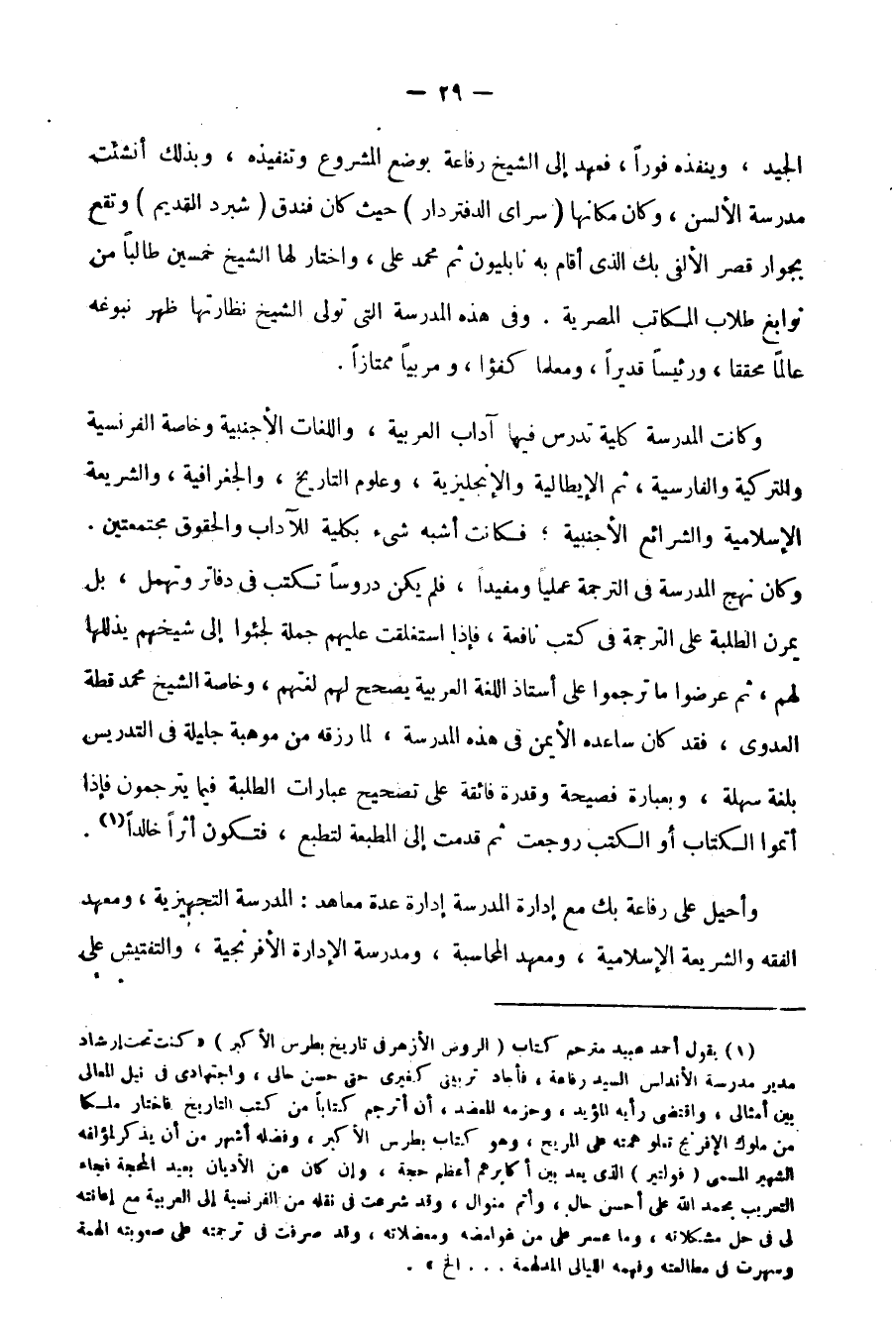عرف الشيخ رفاعة في باريس مدرسة اللغات الشرقية، والتي أسست لدراسة لغات الاستشراق، وكان يسمِّيها في كتابه مدرسة الألسن، فوجب أن تؤسس في مصر مدرسة للألسن تواجه مطالبها وتناسب أغراضها، ورأى في أعضاء البعثات -مهما كثر عددهم- لن يقوموا بكل ما تتطلبه النهضة من جهود، فلابد من إيجاد طبقةٍ من العلماء الاكفاء في الآداب العربية، واللغات الأجنبية، ليضطلعوا بمهمة تعريب الكتب، وليكونوا صلةً بين الثقافة الشرقية والثقافة الغربية.