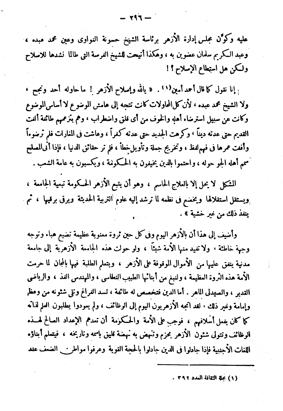المشكل لا يحل إلّا بالعلاج الحاسم، وهو أن يتبع الأزهر الحكومة تبيعة الجامعة، ويستقل استقلالها ويخضع في نظمه لما ترشد إليه علوم التربية الحديثة, ويرقى برقيها، ثم ينفذ ذلك من غير خشية".
