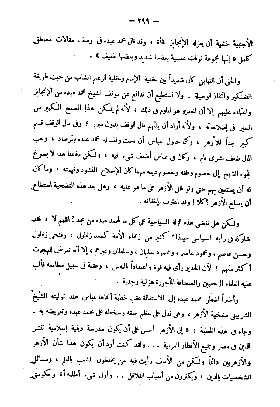 والحق أن التباين كان شديدًا بين عقلية الإمام وعقلية الزعيم الشاب؛ من حيث طريقة التفكير واتخاذ الوسيلة، ولا نستطيع أن ندافع عن موقف الشيخ محمد عبده من الإنجليز واعتماده عليهم, إلّا أن الخديو هو الملوم في ذلك؛ لأنه لم يمكِّنْ هذا المصلح الكبير من السير في إصلاحاته، ولأنه أراد أن يلتهم مال الوقف بدون مبرر؛ وفي مال الوقف قسم كبير جدًّا للأزهر، كلما حاول عباس أن يعبث وقف له محمد عبده بالمرصاد، وحب المال ضعف بشري عام، وكان في عباس أضعف شيء فيه، ولكن دفاعنا هذا لا يسوغ لجوء الشيخ إلى خصوم وطنه وخصوم دينه مهما كان الإصلاح المنشود وقيمته، وما كان له أن يستعين بهم حتى لو ظل الأزهر على ما هو عليه، وهل بعد هذه التضحية استطاع أن يصلح الأزهر؟ كلّا! وقد اعترف بإخفاقه.