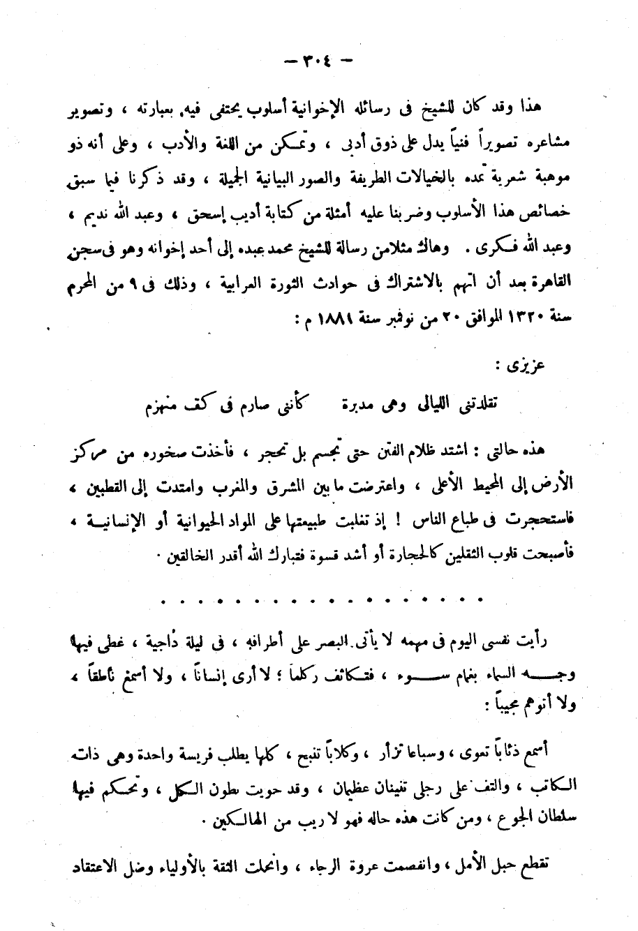 هذا وقد كانت للشيخ في رسائله الإخوانيه أسلوب يحتفي فيه، بعبارته، وتصوير مشاعره تصويرًا فنيًّا يدل على ذوق أدبي، وتمكن من اللغة والأدب، وعلى أنه ذو موهبة شعرية تمده بالخيالات الطريفة والصور البيانية الجميلة، وقد ذكرنا فيما سبق خصائص هذا الأسلوب, وضربنا عليه أمثلةً من كتابة أديب إسحق، وعبد الله نديم، وعبد الله فكري. وهاك مثلًا من رسالة للشيخ محمد عبده إلى أحد إخوانه وهو في سجن القاهرة بعد أن اتهم بالاشتراك في حوادث الثورة العرابية، وذلك في 9 من المحرم سنة 1320, الموافق 20 من نوفمبر سنة 1881م.